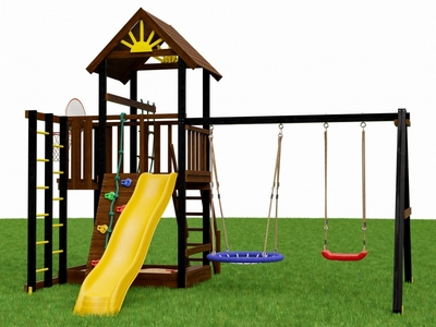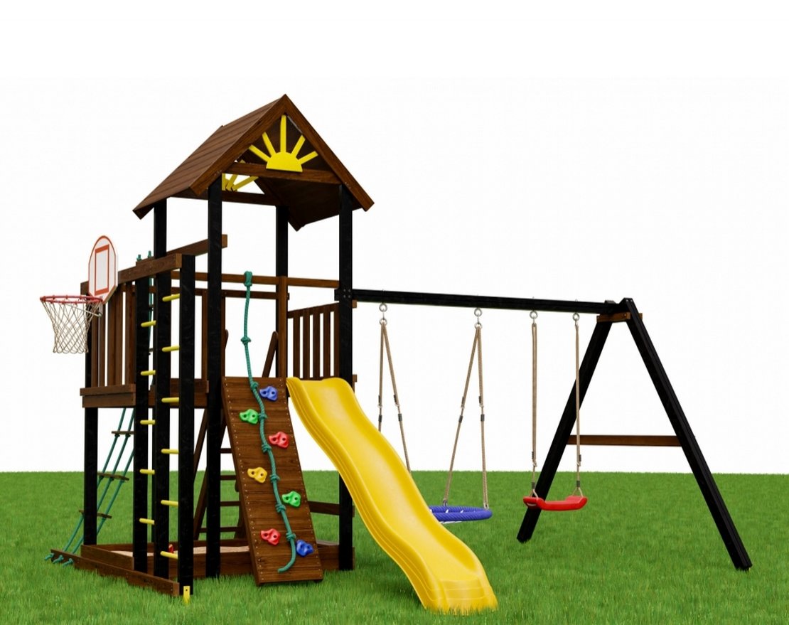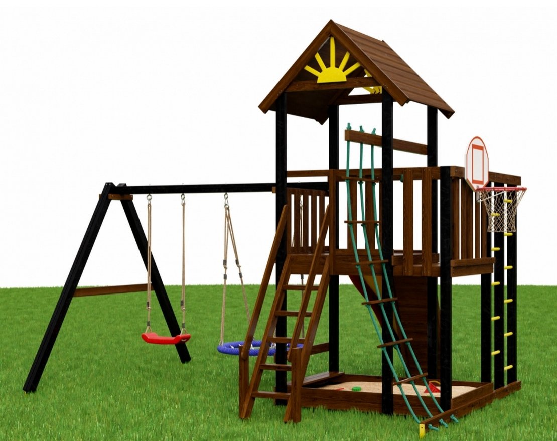 Дети будут в восторге от комплектации. Два вида качелей, горка, баскетбольный щит с кольцом, веревочная лестница и еще более 5 элементов обеспечат незабываемое времяпрепровождение.