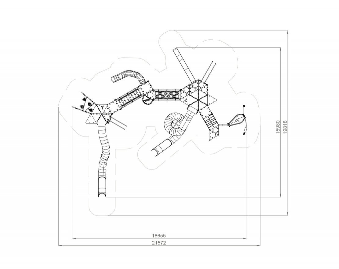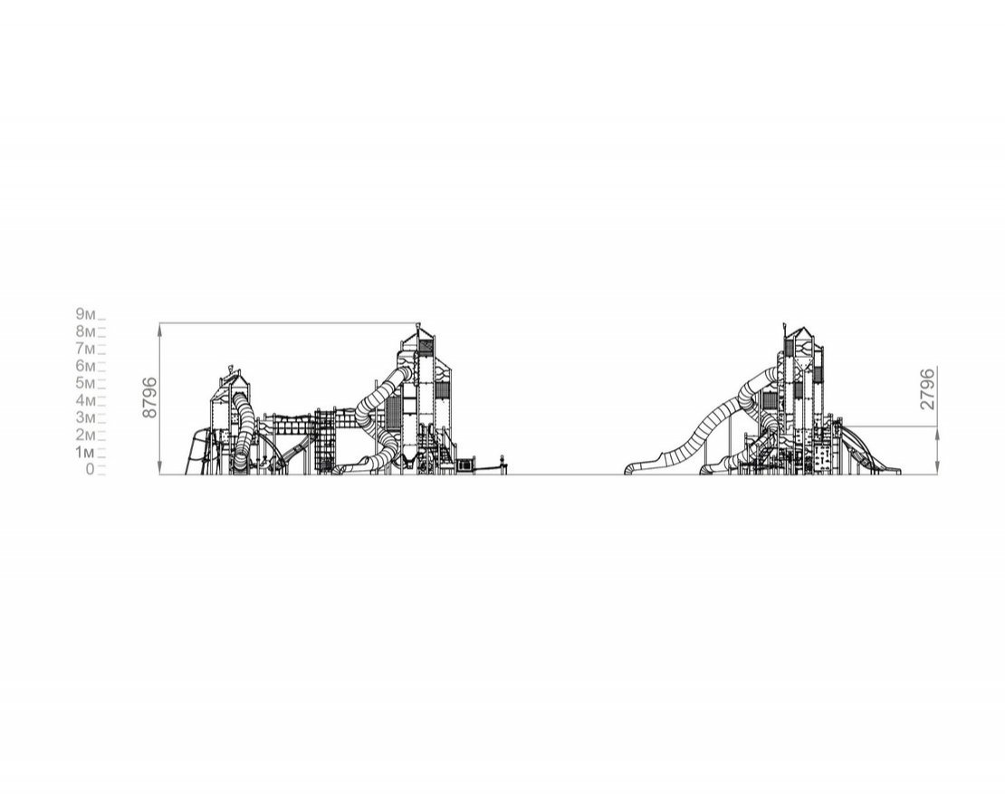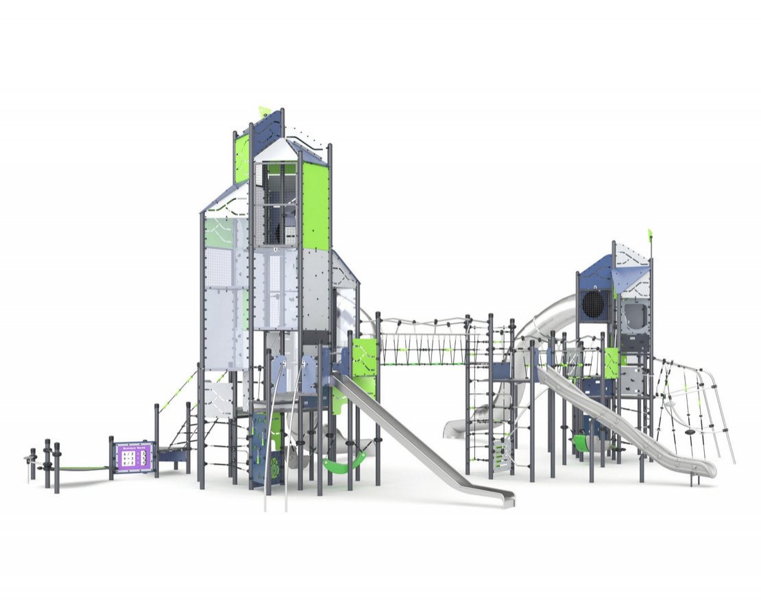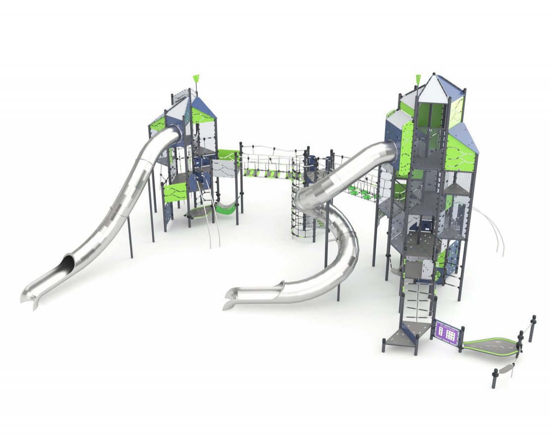 Внутри башен установлены скалодромные панели. Также конструкция оснащена металлическими трубами-лазалками, канатными сетками, интерактивными игровыми панелями и горками.