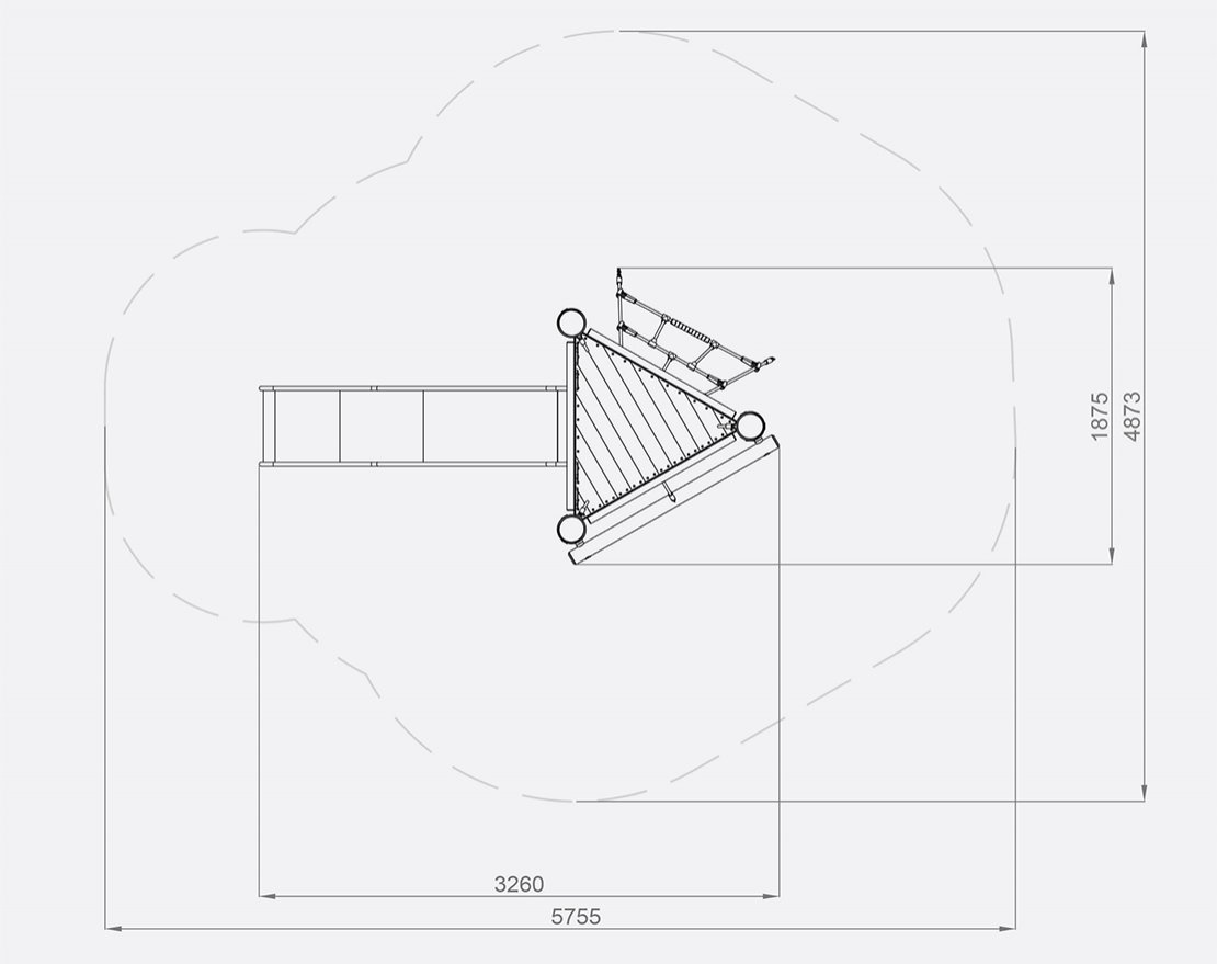 Состоит из опорных стоек, перекладин, канатной сетки и открытой металлической горки с защитными бортиками. Для большего комфорта, конструкция оснащена ручками-стропами.