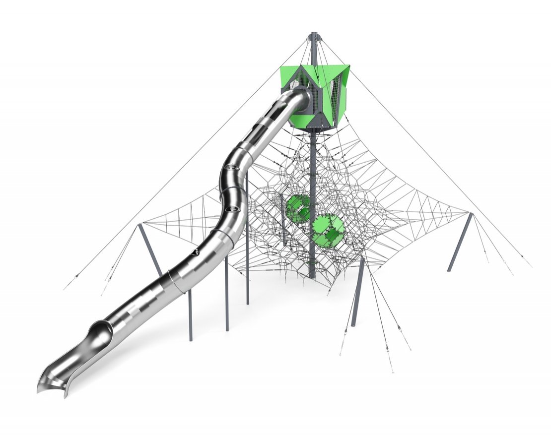Состоит из металлических опорных стоек, высокопрочного каната и закрытой металлической тоннельной горки. Сверху конструкция оснащена защитной сеткой из металлических прутиков и панелями из HDPE.