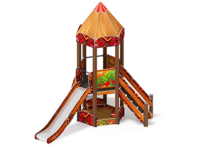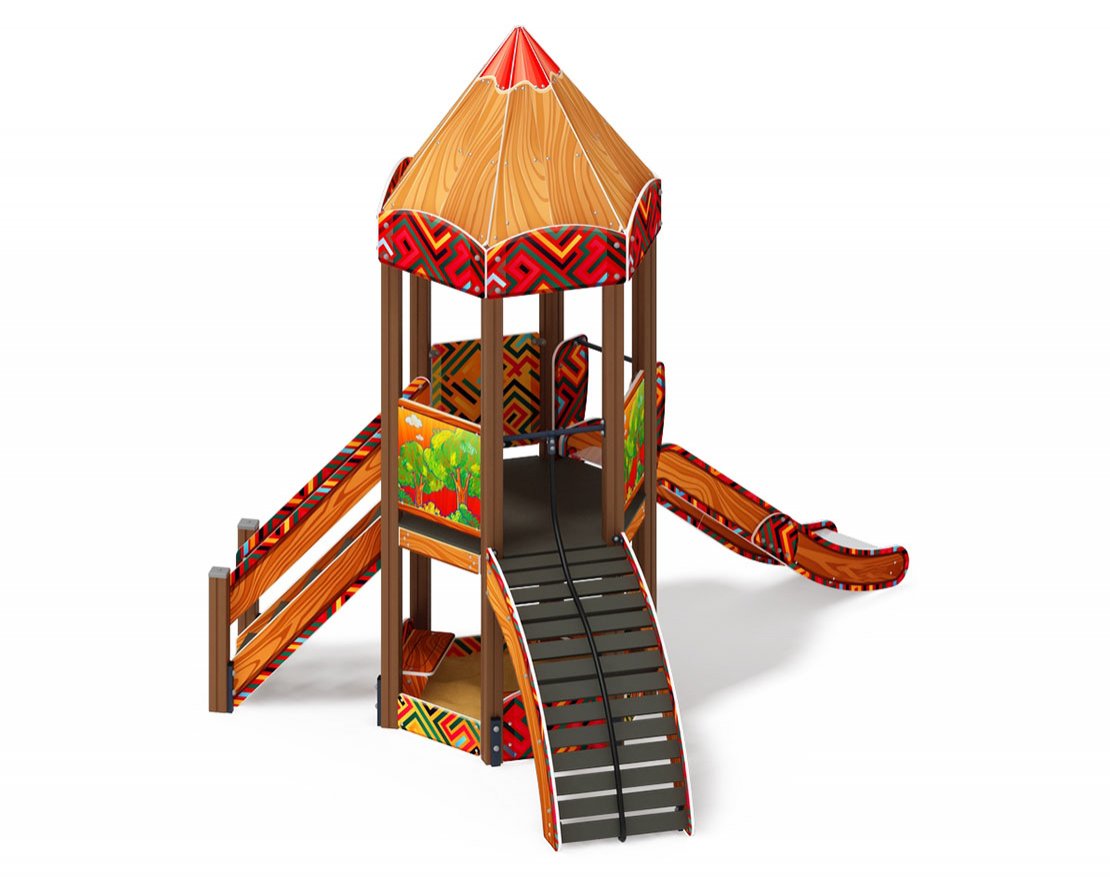Выполнена из шести клеёных брусьев 100х100 мм высота бруса 3000 мм; пол из ламинированной фанеры, с антискользящим покрытием мм толщиной 18 мм по лагам из ламинированной и влагостойкой фанеры. Над башней имеется шести- скатная крыша из фанеры толщиной 12 мм, кромки фанеры тщательно шлифованы, фанера окрашена с нанесением принта. Крыша поставляется в сборе. Внешний периметр крыши закрыт декоративными арками из влагостойкой фанеры толщиной 18 мм, габарит арки-780х380 мм. Отметка пола башни от планировочной отметки площадки 1200мм. Высота башни 3970 мм.