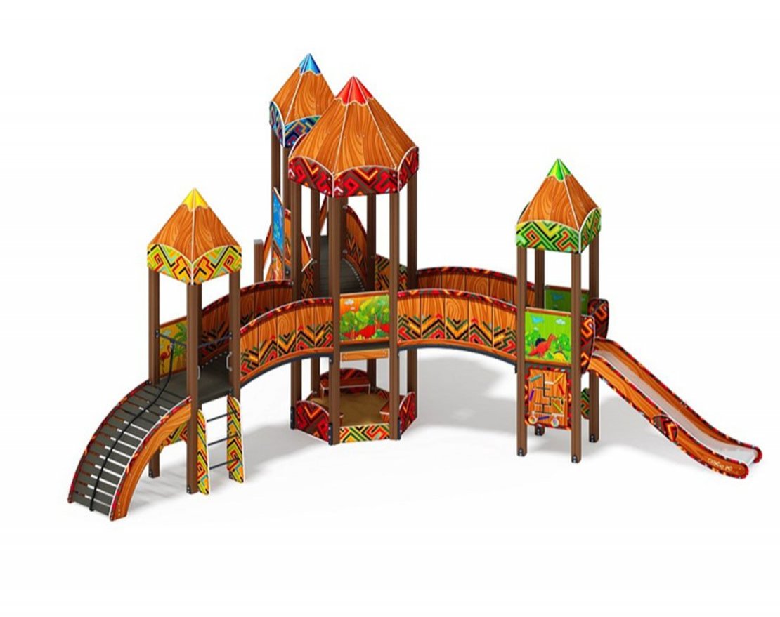 Три башни выполнены из клеёных брусьев 100х100 мм высота бруса 3000 мм; пол из ламинированной фанеры с антискользящим покрытием толщиной 18 мм. Башня украшена стилизованными декоративными арками (780х380х18мм) и четырехскатной крышей, крыша поставляется в сборе и выполнена из влагостойкой фанеры толщиной 12 мм (габариты в сборе 770х770х740мм), кромки фанеры тщательно шлифованы, окрашены с нанесением принта.