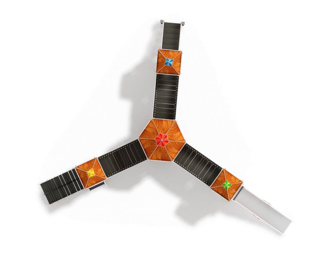 Шестигранная башня выполнена из шести клеёных брусьев 100х100 мм высота бруса 3500 мм; пол из ламинированной фанеры, с антискользящим покрытием мм толщиной 18 мм по лагам из ламинированной и влагостойкой фанеры. Над башней имеется шести-скатная крыша из фанеры толщиной 12 мм, кромки фанеры тщательно шлифованы, фанера окрашена с нанесением принта. Крыша поставляется в сборе. Внешний периметр крыши закрыт декоративными арками из влагостойкой фанеры толщиной 18 мм, габарит арки-780х380 мм. Отметка пола башни от планировочной отметки площадки 1200мм. Высота башни 4470 мм.