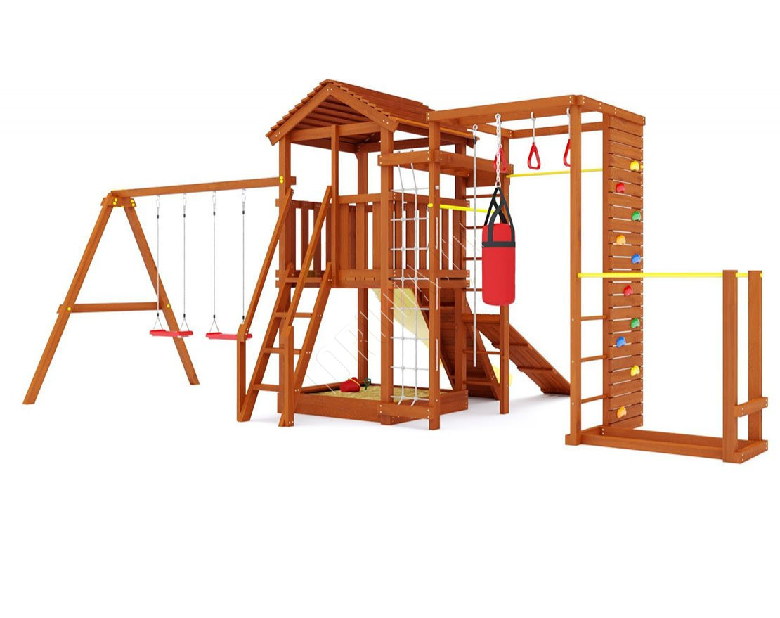 В основе натуральный материал – клееный брус 75х75 мм, изготовлена из безопасных материалов. Конструкция и элементы качельных подвесов разработаны и произведены согласно ГОСТ.