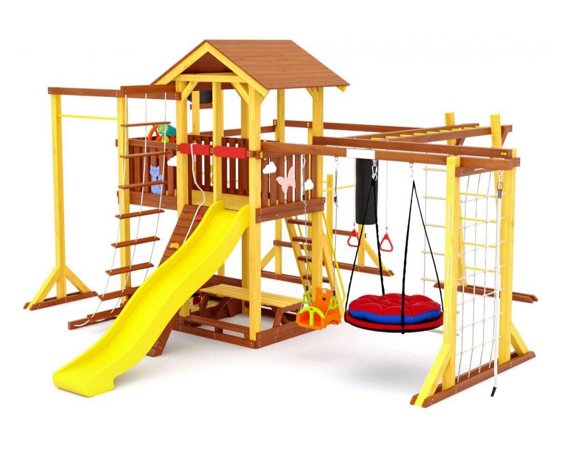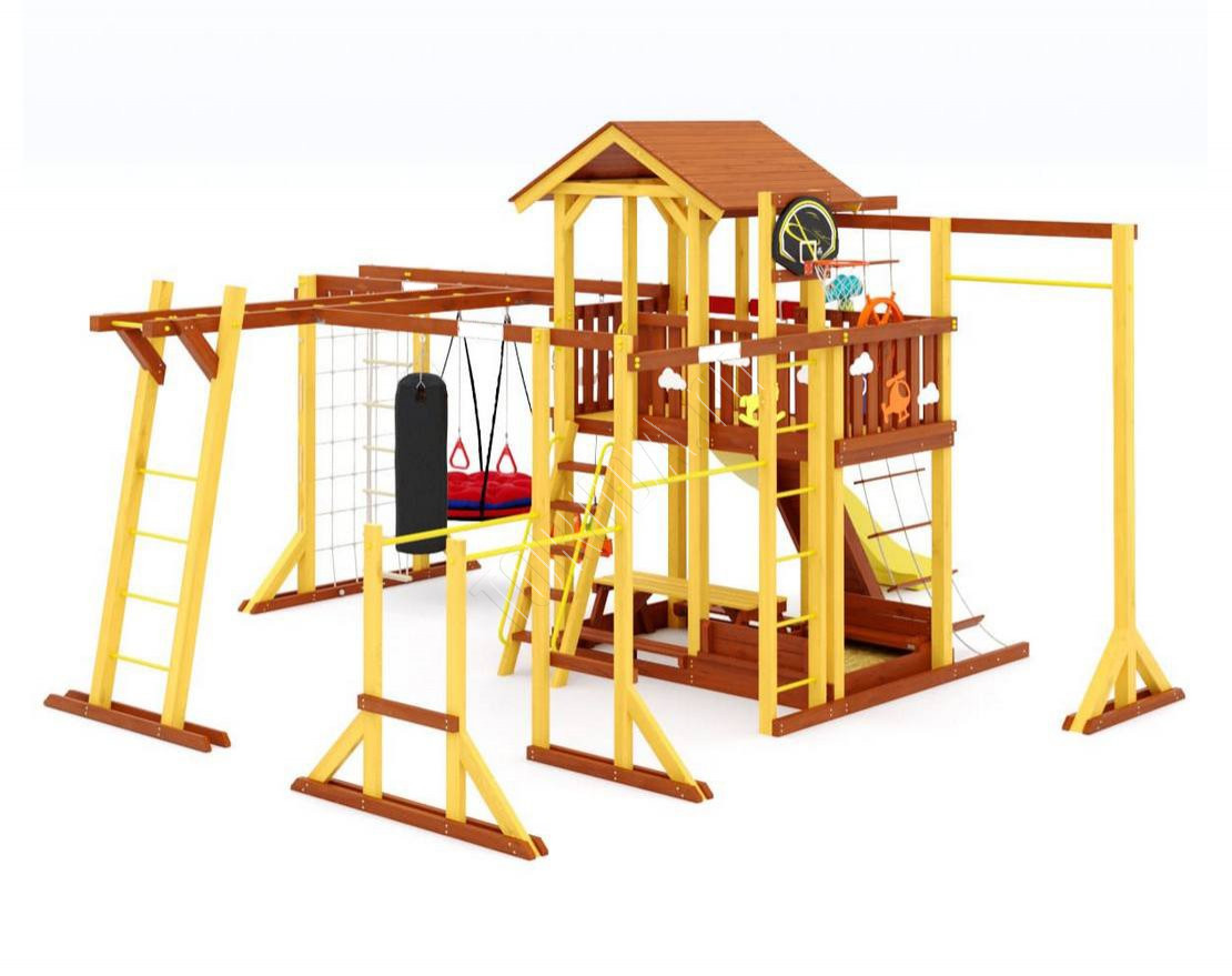 - Многообразие игровых элементов: в комплектацию входят скалодром, сетка-лазалка, турники, гимнастические кольца, песочница с крышкой, которая трансформируется в две лавочки, и многое другое.