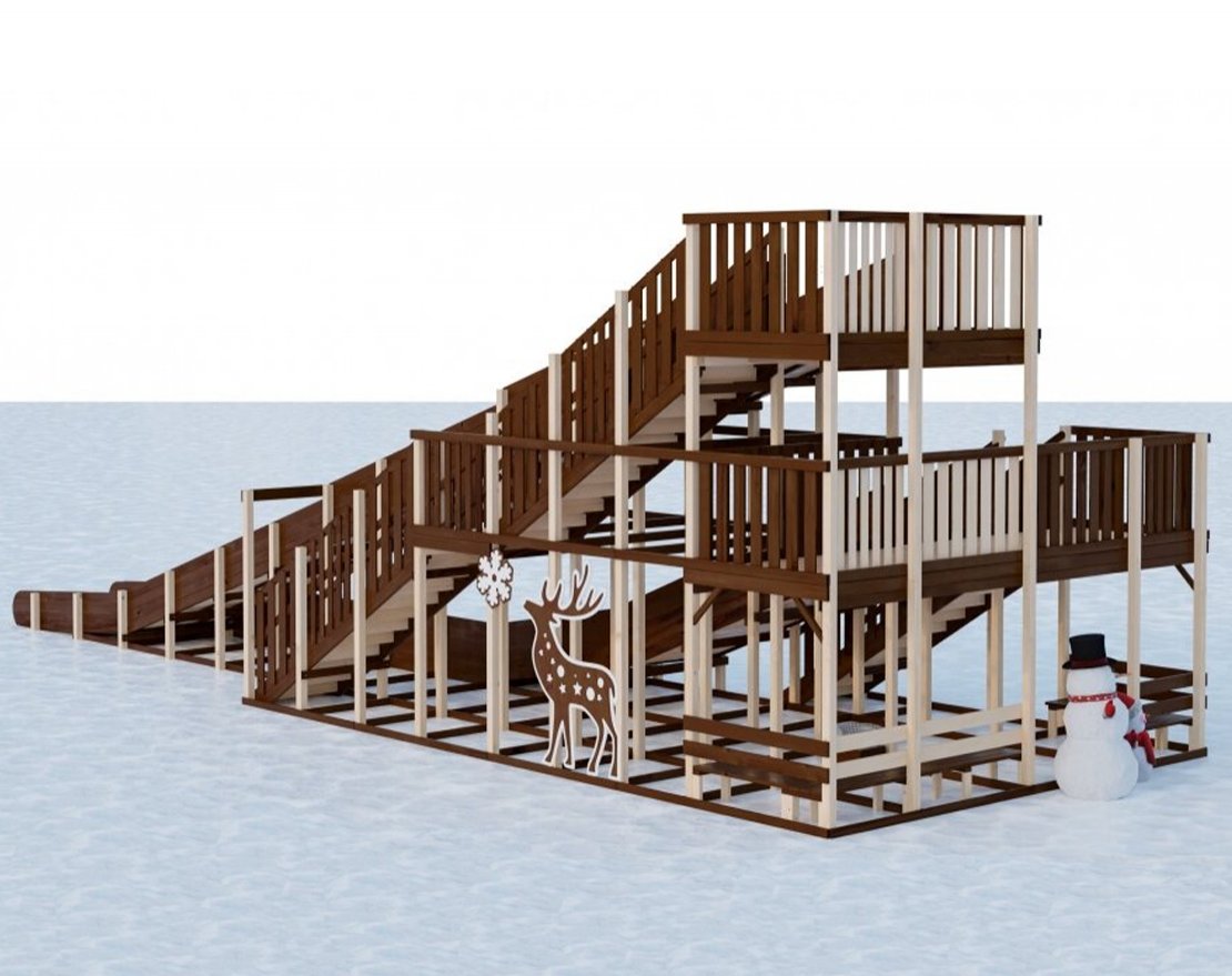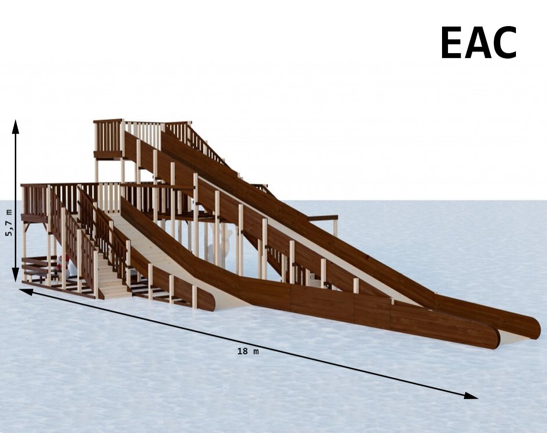 Комплекс предлагает два ската: один высотой 4,5 метра, предназначенный для взрослых, и другой — 2,3 метра, который идеально подходит для детей.