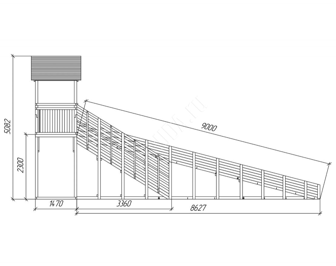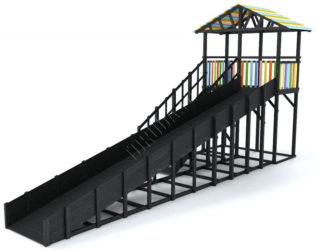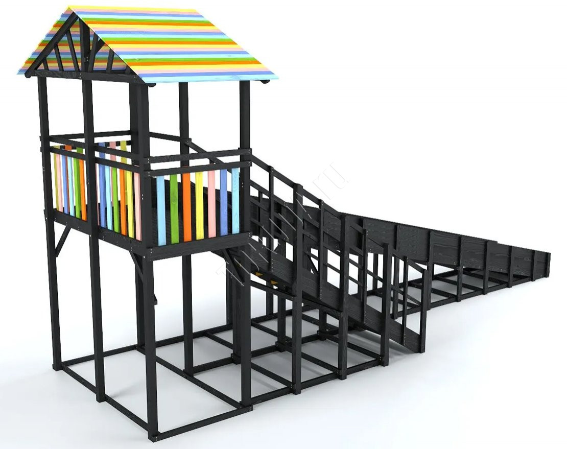 Конструкция надёжна и устойчива, выполнена из клееного бруса сечением 90×90 мм. Все поверхности тщательно шлифуются, углы скруглены, а бортики и прочные перила обеспечивают максимальную безопасность.
