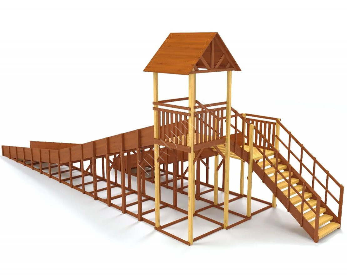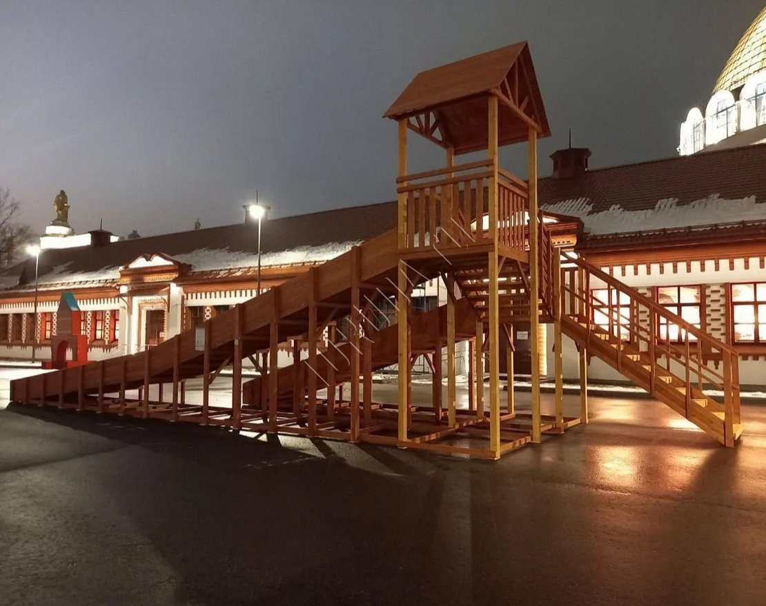 При изготовлении конструкций уделяется особое внимание безопасности всех элементов: углы скруглены и поверхности тщательно отшлифованы. Лесенки, перила и страховочные ограждения продуманы с точки зрения безопасности и удобства для детей.