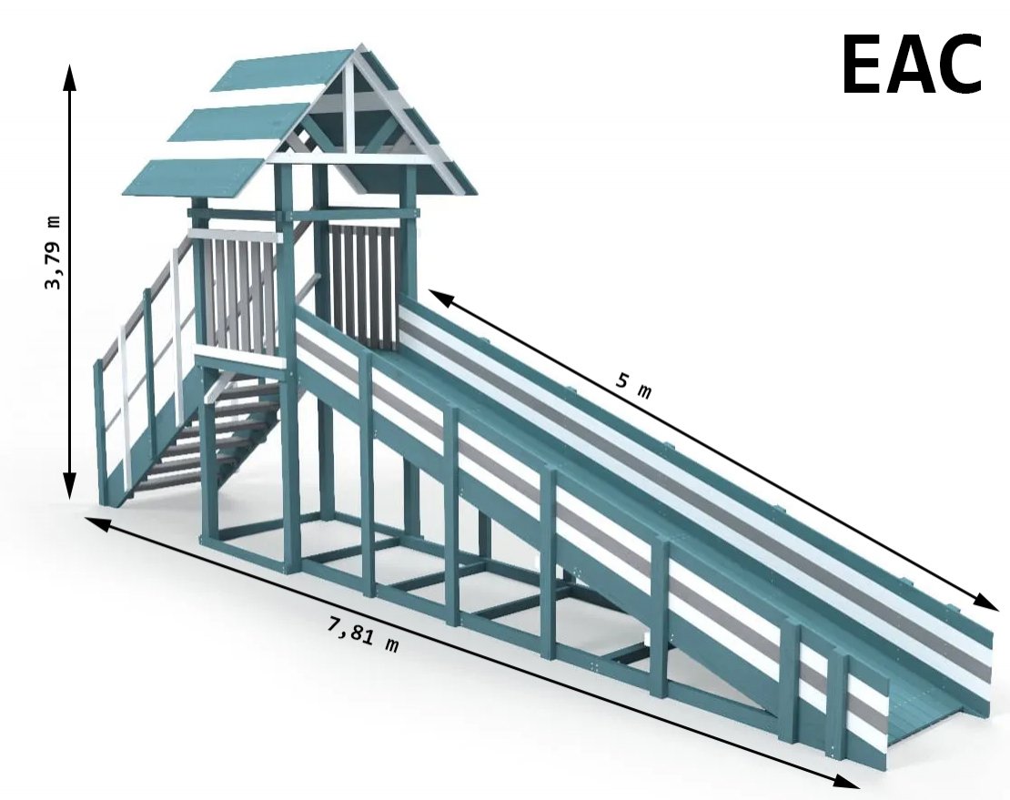 Каркас выполнен из прочного клеёного бруса камерной сушки. Все поверхности тщательно отшлифованы, углы скруглены, а крепежи закрыты заглушками. Деревянная крыша защищает площадку от осадков, а специальное атмосферостойкое покрытие сохраняет древесину в идеальном состоянии.