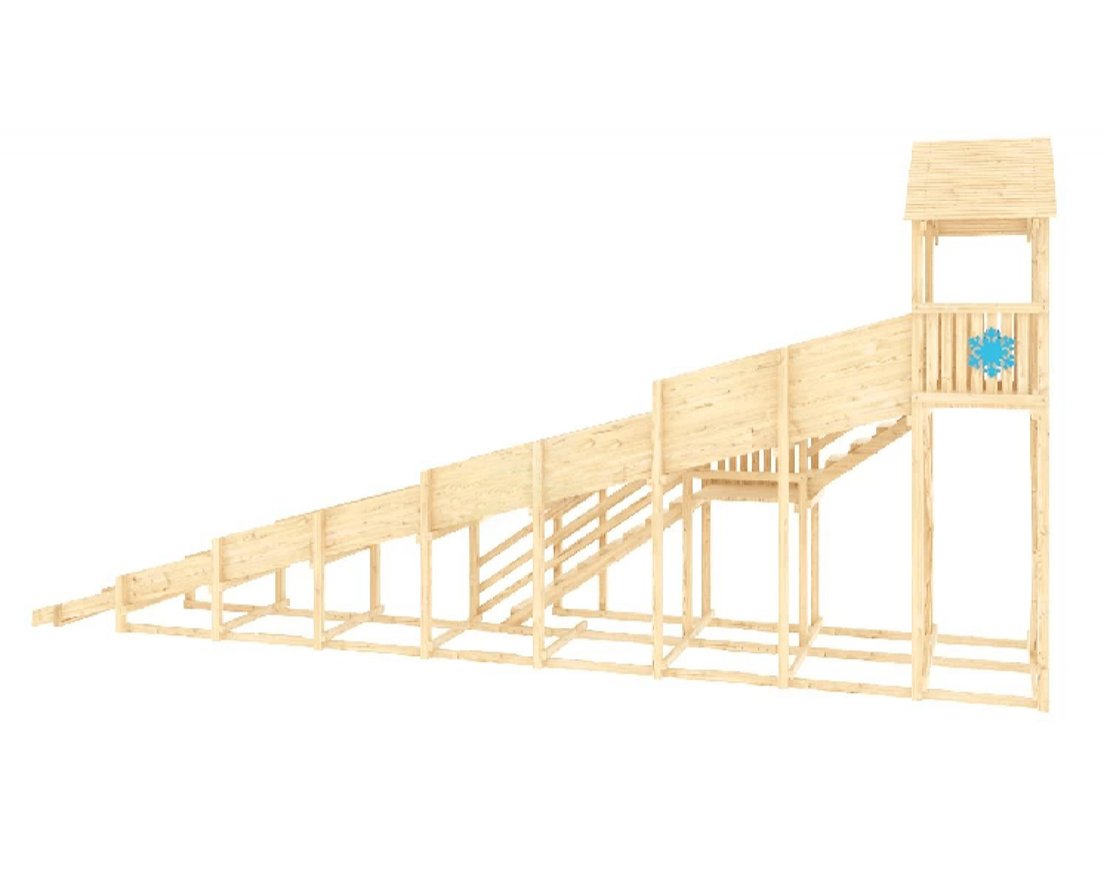 10-ти метровый скат безопасен для катания детей дошкольного возраста, потому что он имеет оптимальную высоту. Дети могут подниматься вверх по удобной лестнице, держась за перила. Площадка в верхней части достаточно просторная и оборудована деревянной крышей. Она позволит ребятам укрыться от обильных осадков, ветра, весело общаясь друг с другом.