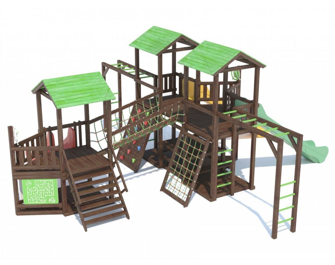 Основа детской игровой - спортивной конструкции – три башни с мостами и балконами «серия I». Конструкция оснащена тремя двухскатными деревянными крышами, встроенным полом, встроенным столиком с лавками в нижней части конструкции, тремя пластиковыми антивандальными скатами с превосходной скользящей поверхностью, двумя «П»-образными деревянными рукоходами, скалодромом, канатной лестницей с армированным канатом, деревянной лестницей, антивандальными пластиковыми игровыми панелями и антивандальными штурвалами. Для безопасности ребенка предусмотрены перила на лестнице, заборчики и ограждения над зонами препятствий (скат).