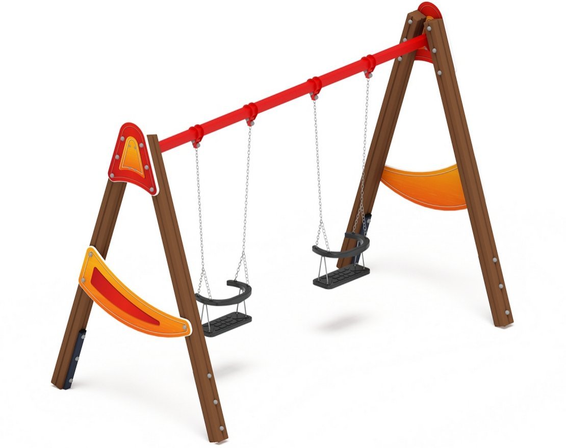 Сиденье и спинка подвешивается к штанге качели цепями через наконечники. Цепь - короткозвеньевая, некалиброванного класса, прочность металла Т(8), диаметр сечения звена цепи 6 мм. Наконечник выполнен из профиля 30х30 мм, втулки и подшипника. Наконечник окрашен в красный цвет. Цепь защищена термоусадочной трубкой на всю длину.