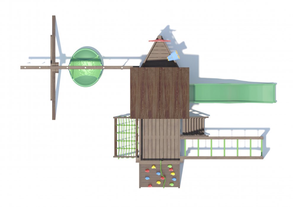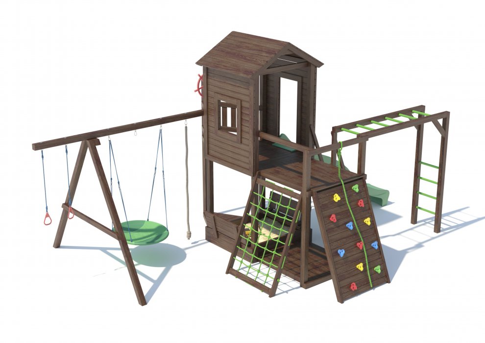 Основа детской игровой - спортивной конструкции - башня с террасой и игровой платформой. Конструкция оснащена двускатной деревянной крышей, пластиковым волнообразным скатом с превосходной скользящей поверхностью, деревянной лестницей, широким скалодромом, канатной лестницей, деревянным рукоходом, приставными качелями, сидением качели «гнездо», канатом, гимнастическими кольцами, встроенным домиком в верхней части конструкции и встроенной песочницей с крышкой «трансформер» в основании конструкции. Добавит ярких эмоций в развивающие игры ребенка бинокль и штурвал. Для безопасности ребенка предусмотрены перила на лестнице, заборчики и ограждения над зонами препятствий (скалодром, канатная лестница, скат).