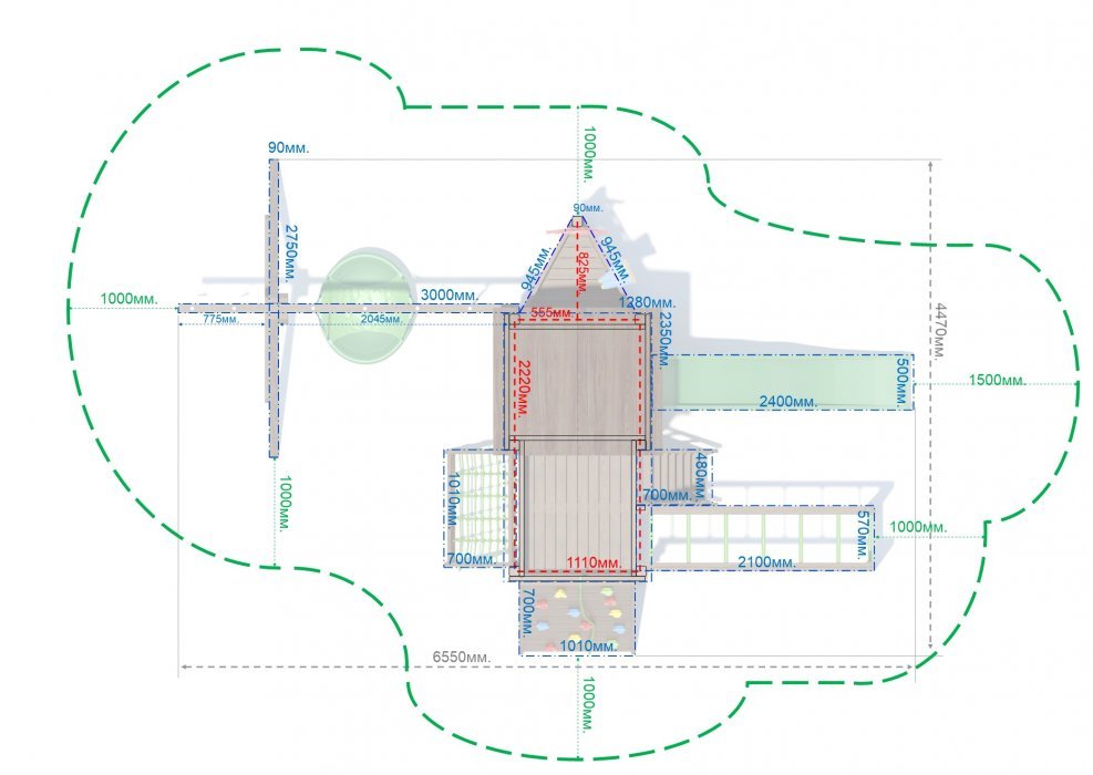 Площадь поверхности детской площадки = габариты конструкции по крайним точкам + 1000/1500мм. по периметру конструкции. Поверхность должна быть твердой, ровной, свободной от насаждений, горизонтальной без перепадов, допустимый уклон не более 20мм. на 10п.м.