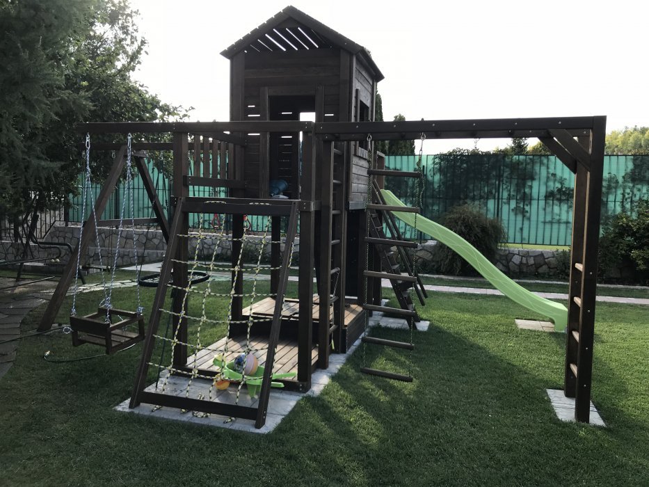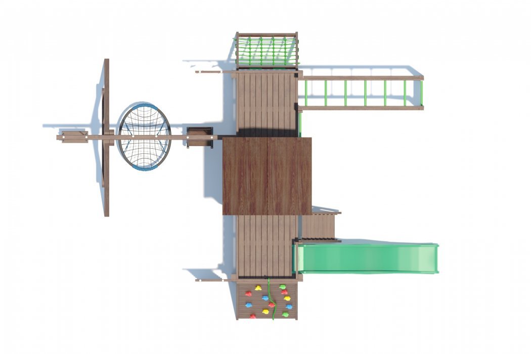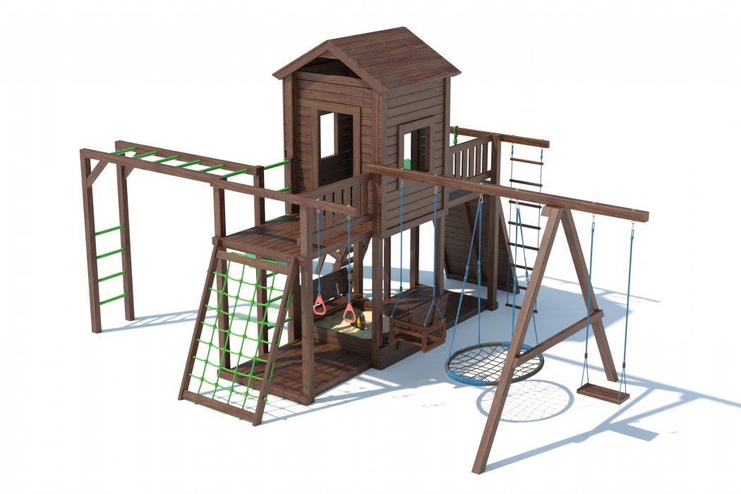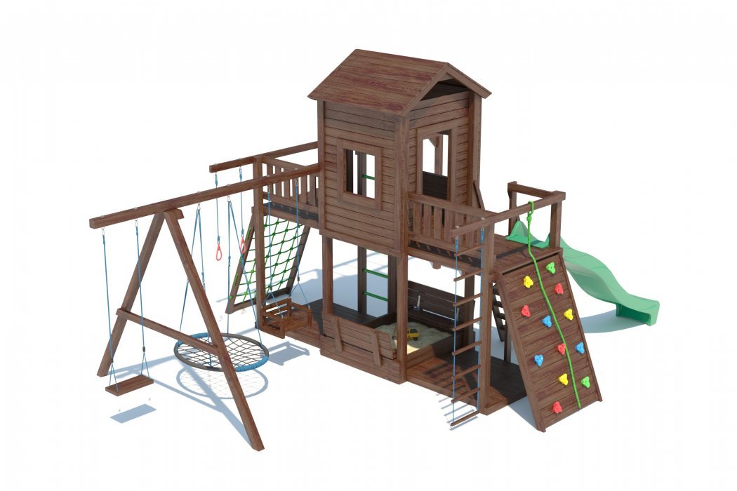 Основа детской игровой - спортивной конструкции - башня с террасой и игровой платформой. Конструкция оснащена двускатной деревянной крышей, встроенным домиком в верхней части конструкции, встроенной песочницей с крышкой «трансформер» в нижней части конструкции, дополнительной платформой в основании конструкции, пластиковым волнообразным скатом с превосходной скользящей поверхностью, деревянной лестницей, широким скалодромом, канатной лестницей, деревянным рукоходом, шведской стенкой, приставными качелями, сидением качели «гнездо», сидением качели «малютка», гимнастическими кольцами, подвесной лестницей. Для безопасности ребенка предусмотрены перила на лестнице, заборчики и ограждения над зонами препятствий (скалодром, канатная лестница, скат).