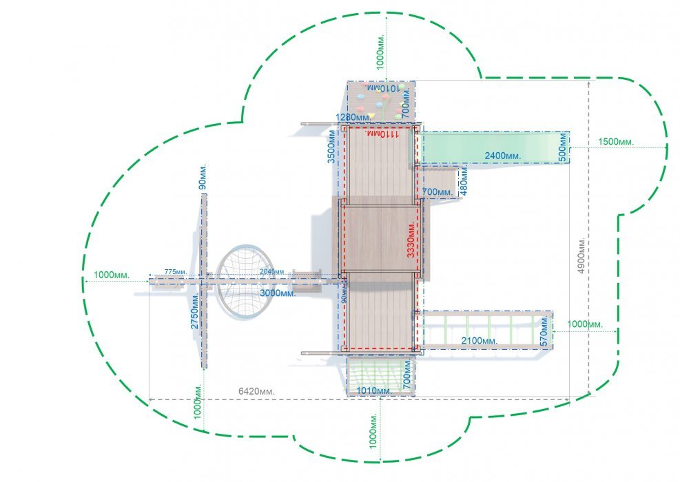 Площадь поверхности детской площадки = габариты конструкции по крайним точкам + 1000/1500мм. по периметру конструкции. Поверхность должна быть твердой, ровной, свободной от насаждений, горизонтальной без перепадов, допустимый уклон не более 20мм. на 10п.м.
