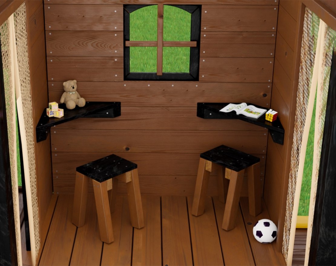 Игровой комплекс Мулен 2 — это уютный деревянный домик, наполненный атмосферой приключений. Его узнаваемый силуэт с декоративными лопастями на крыше перенесет детей в мир сказок, где можно представить себя отважным путешественником, хозяином мельницы или капитаном воздушного корабля. Площадка сочетает различные игровые и спортивные элементы, помогая ребенку развивать ловкость, силу и координацию. Лестницы, канаты, качели и горка превращают игру в увлекательное приключение, в котором важно не только фантазировать, но и двигаться. Внутри домика продумано всё до мелочей — каждый уголок наполнен возможностями для игры, творчества и удобства. На втором этаже маленьких художников ждет доска для рисования, где можно воплощать свои фантазии. Два отдельных столика со стульчиками позволяют детям играть, рисовать или устраивать чаепитие, не мешая друг другу. А просторная песочница под домиком станет местом для совместных экспериментов с песочными замками — здесь хватит места всем! Два раздельных входа делают пространство более просторным и удобным, создавая еще больше возможностей для веселой и динамичной игры.