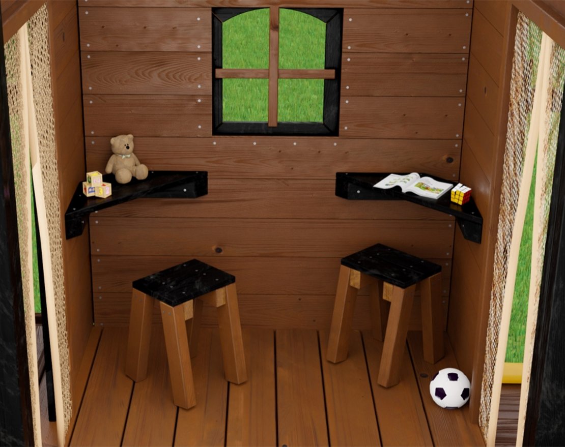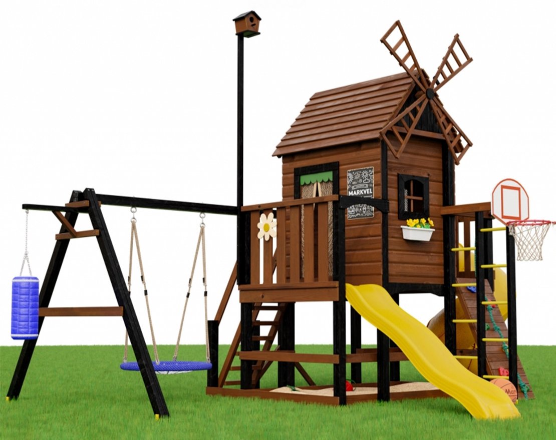 Игровой комплекс Мулен 4 — это уютный деревянный домик, наполненный атмосферой приключений. Его узнаваемый силуэт с декоративными лопастями на крыше перенесет детей в мир сказок, где можно представить себя отважным путешественником, хозяином мельницы или капитаном воздушного корабля. Площадка сочетает различные игровые и спортивные элементы, помогая ребенку развивать ловкость, силу и координацию. Лестницы, канаты, качели и горка превращают игру в увлекательное приключение, в котором важно не только фантазировать, но и двигаться. Внутри домика продумано всё до мелочей — каждый уголок наполнен возможностями для игры, творчества и удобства. На втором этаже маленьких художников ждет доска для рисования, где можно воплощать свои фантазии. Два отдельных столика со стульчиками позволяют детям играть, рисовать или устраивать чаепитие, не мешая друг другу. А просторная песочница под домиком станет местом для совместных экспериментов с песочными замками — здесь хватит места всем! Два раздельных входа делают пространство более просторным и удобным, создавая еще больше возможностей для веселой и динамичной игры.