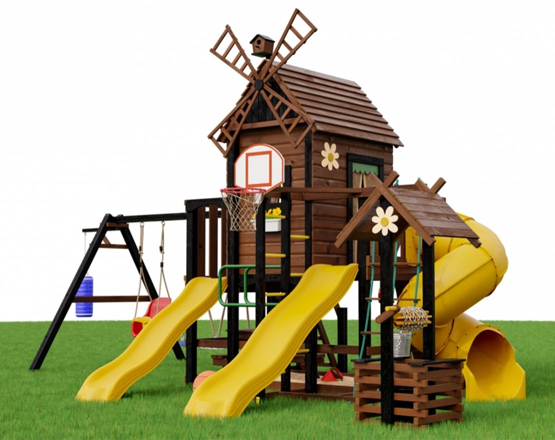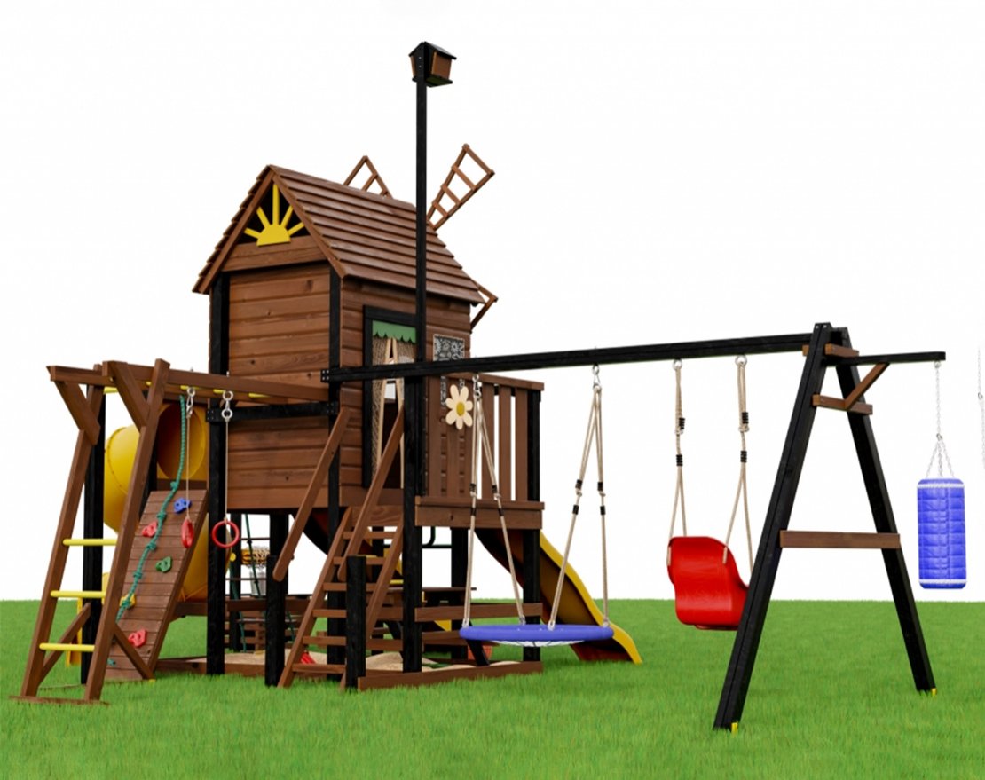 Игровой комплекс Мулен 6 с колодцем — это уютный деревянный домик, наполненный атмосферой приключений. Его узнаваемый силуэт с декоративными лопастями на крыше перенесет детей в мир сказок, где можно представить себя отважным путешественником, хозяином мельницы или капитаном воздушного корабля. Площадка сочетает различные игровые и спортивные элементы, помогая ребенку развивать ловкость, силу и координацию. Лестницы, канаты, качели и горка превращают игру в увлекательное приключение, в котором важно не только фантазировать, но и двигаться. Внутри домика продумано всё до мелочей — каждый уголок наполнен возможностями для игры, творчества и удобства. На втором этаже маленьких художников ждет доска для рисования, где можно воплощать свои фантазии. Два отдельных столика со стульчиками позволяют детям играть, рисовать или устраивать чаепитие, не мешая друг другу. А просторная песочница под домиком станет местом для совместных экспериментов с песочными замками — здесь хватит места всем! Два раздельных входа делают пространство более просторным и удобным, создавая еще больше возможностей для веселой и динамичной игры.