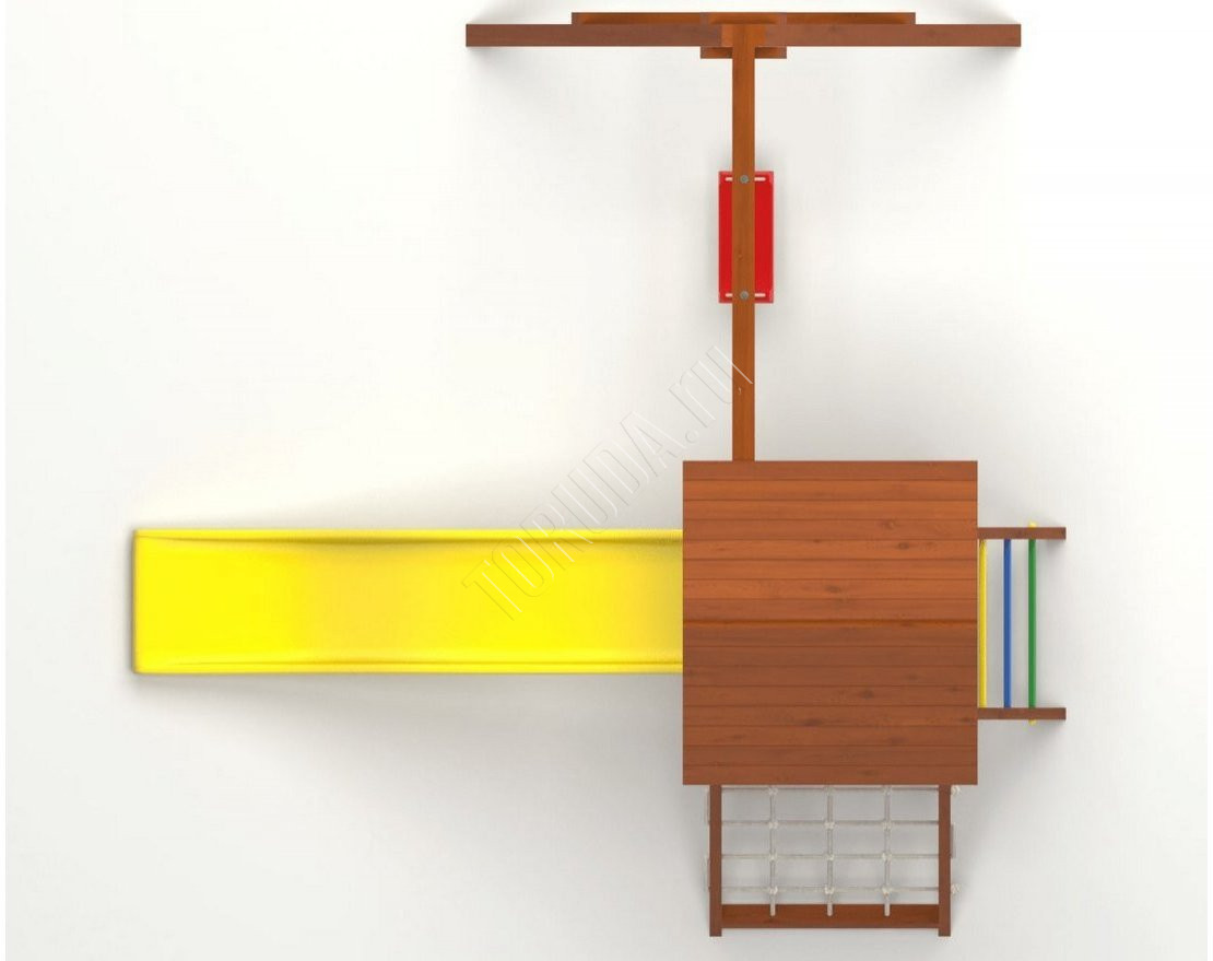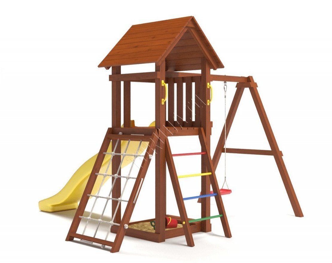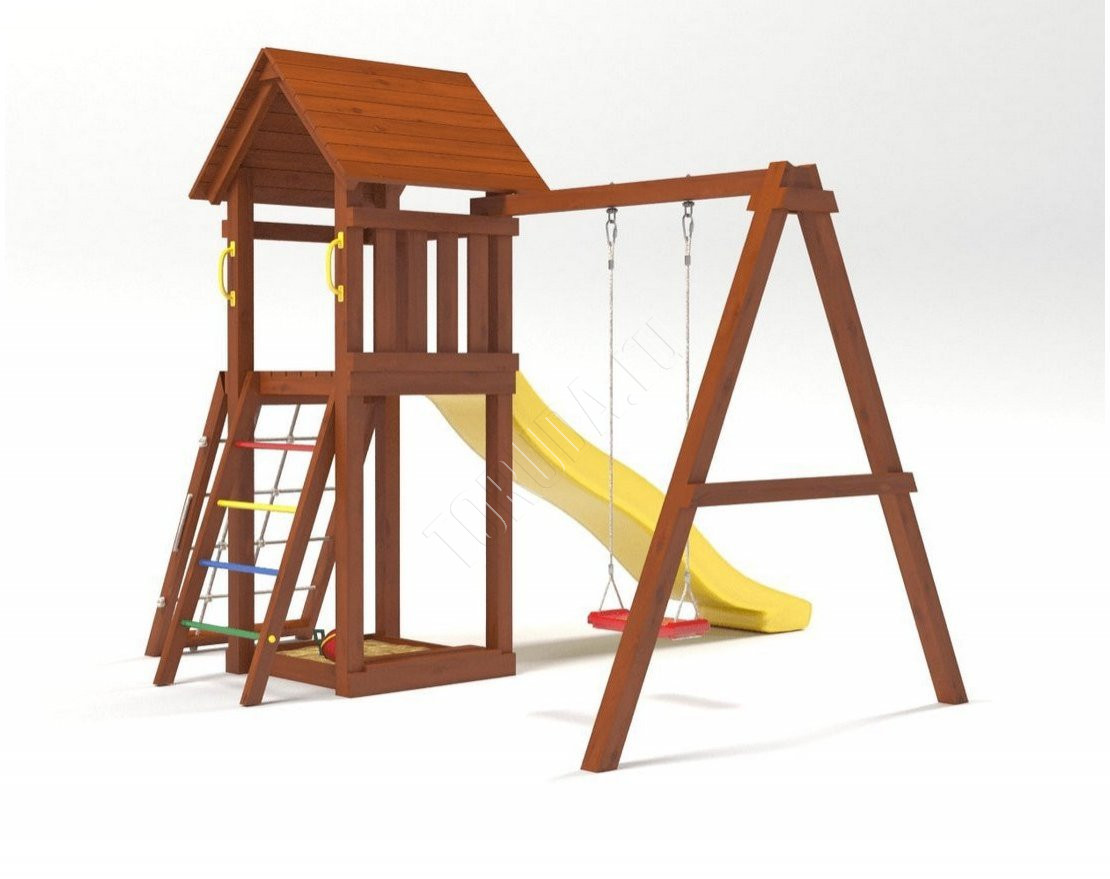 - Домик закрыт сверху деревянным перекрытием – оно скрывает от прямых солнечных лучей и позволяет передохнуть на свежем воздухе. Комплекс универсален, поскольку включает в себя столь любимые детьми горку и качели.