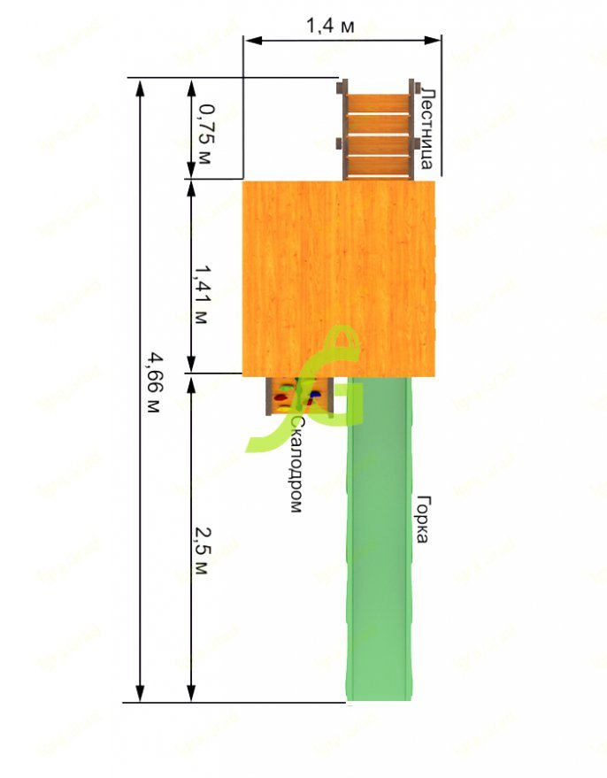 - скалодром - ключевой элемент данной модели. На деревянной основе надёжно закреплены пластиковые держатели, имитирующие разноцветные камни. Поднявшись по скалодрому, малыш попадёт на второй уровень площадки;