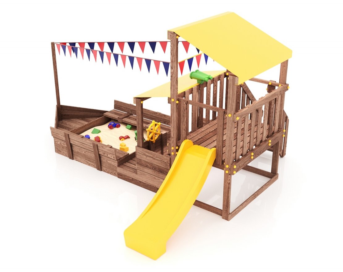 Детская песочница с крышками-лавочками и кораблик, включающий в себя штурманскую рубку и капитанский мостик с горкой с высоты 900 мм с флажками, а также две крыши закрытые тентом, чтобы можно было отправиться в дальнее плавание даже под дождем.