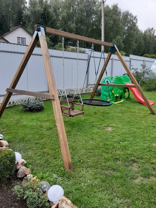 - сидение качели деревянное 520х450х370мм. / зона посадки 440х340х300мм. (брус лиственницы сечением 40х40мм., планкен лиственницы сечением 90х20мм.) - 1ком.;