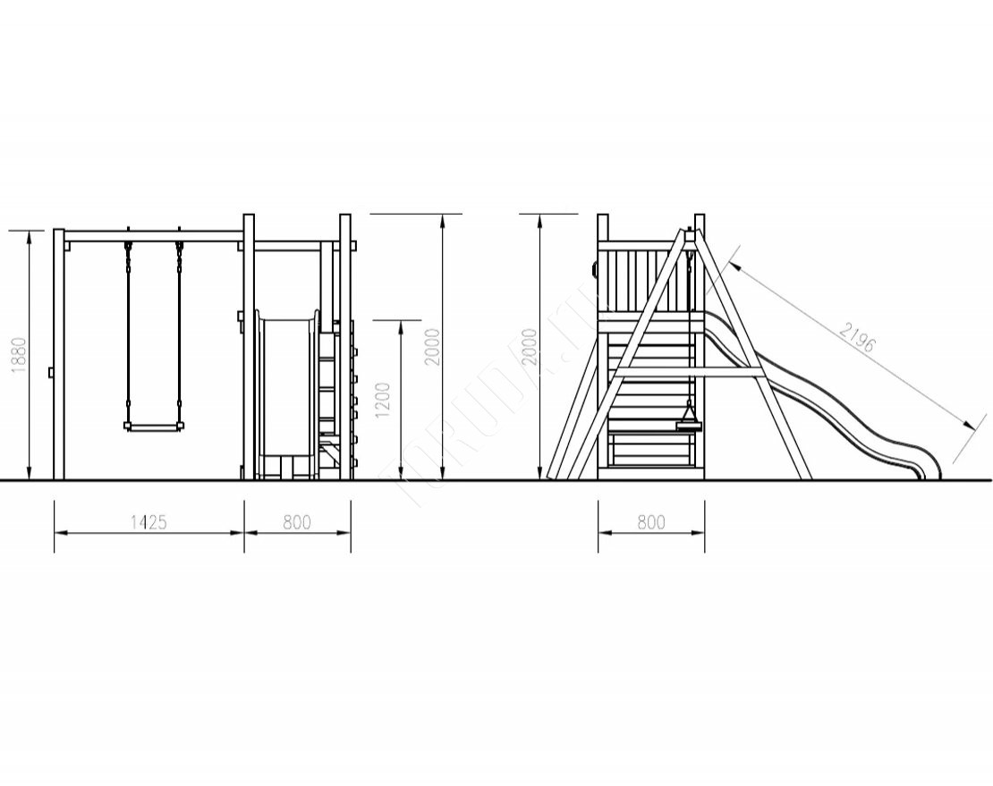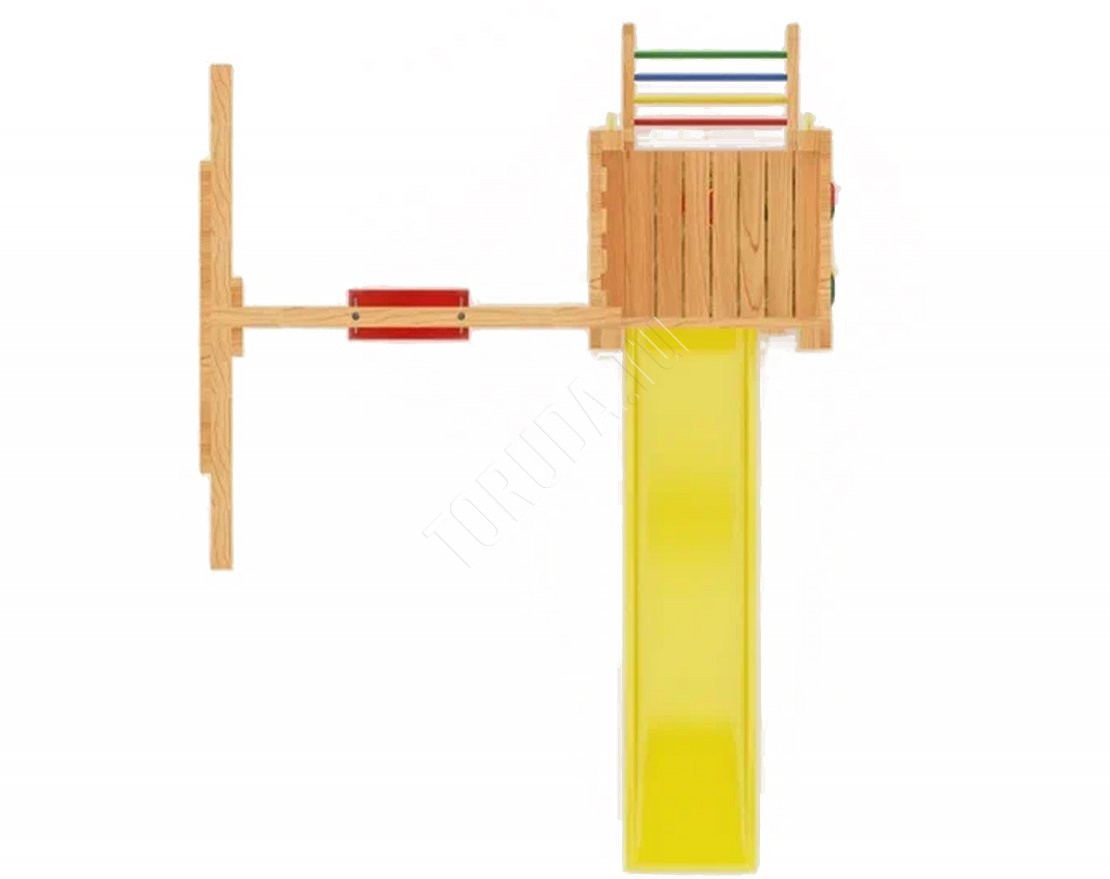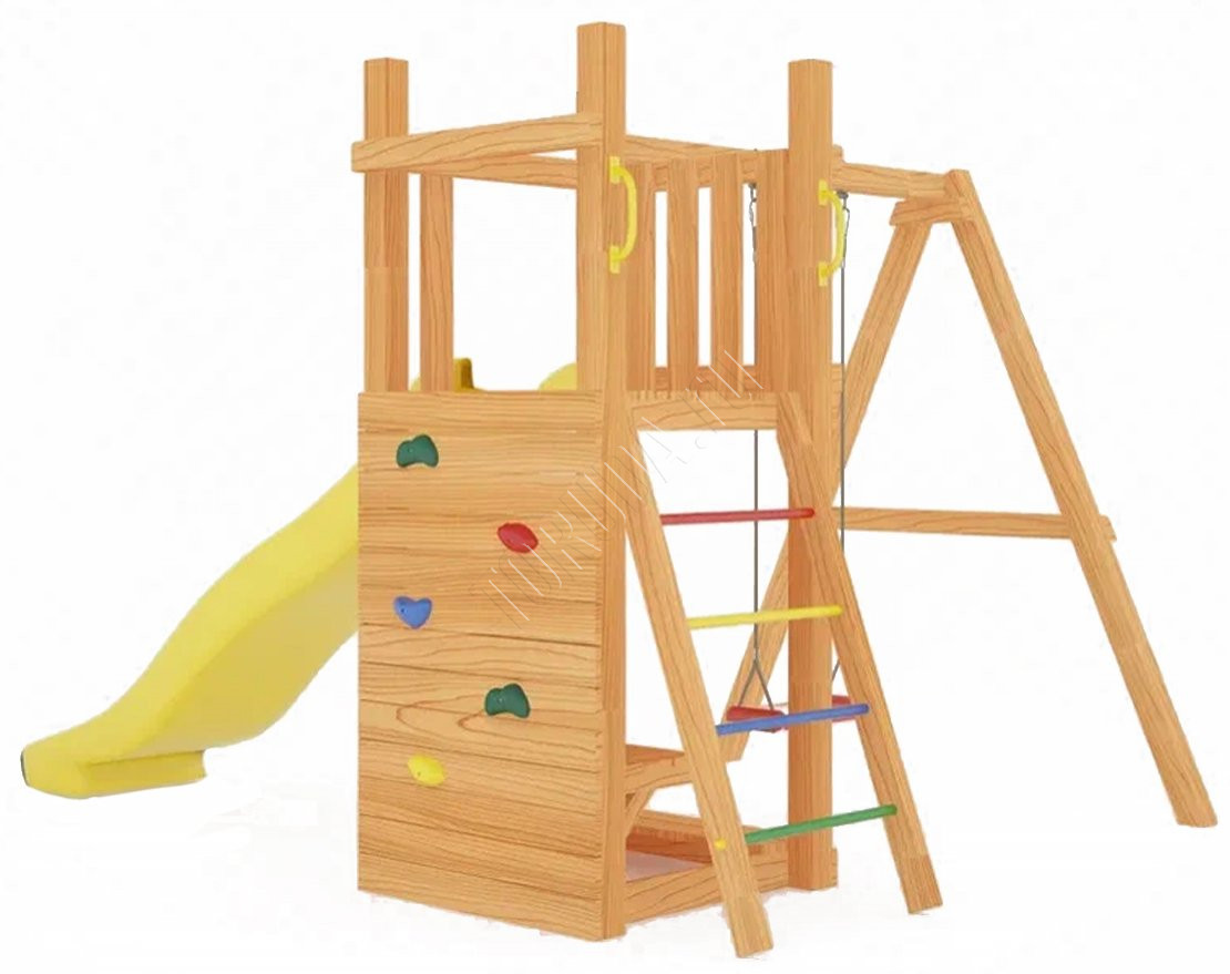 Площадка наполнит досуг детей энергией и радостью. Она компактная и займёт всего лишь несколько квадратных метров участка дачного или загородного дома. Покрытие с антисептиком защитит натуральные составляющие от непогоды (наносится самостоятельно).
