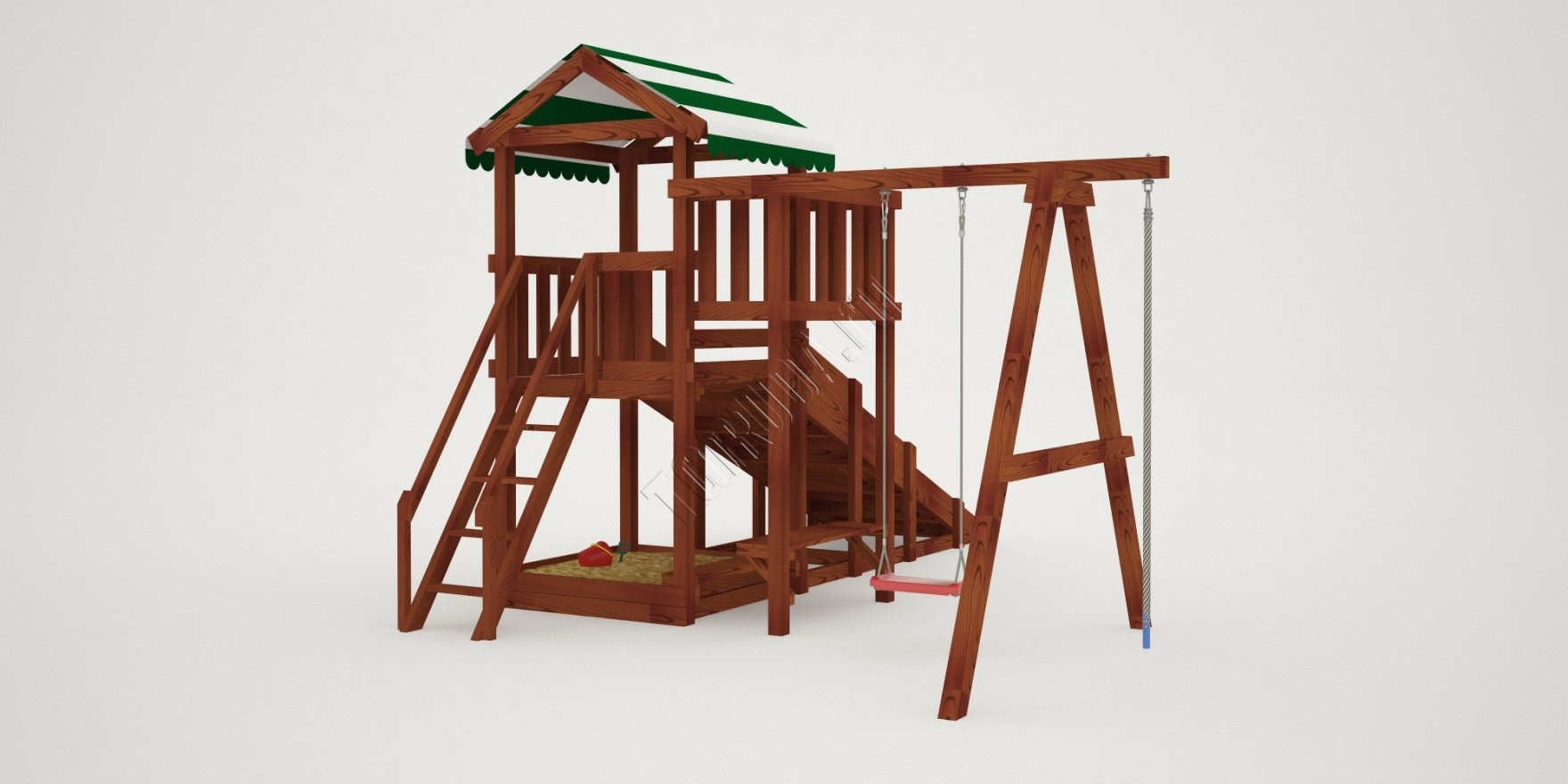 Также в модели есть еще один дополнительный канат для полноценного лазания – он расположен слева от качелей. Для любителей более спокойных игр предусмотрена песочница с удобной лавочкой для игральных принадлежностей.
