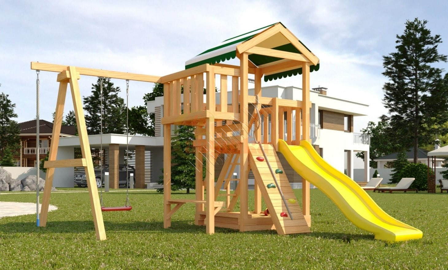 Всесезонная модель Гарда 1 обладает натуральным цветом дерева без покрытия и модульной конструкцией. Одновременно на площадке могут играть несколько детей. Основа конструкции – игровая башня с балкончиком и яркой пластиковой горкой.