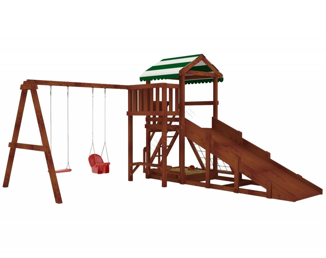 Поднявшись наверх можно поиграть на балкончике, с него будет открываться хороший вид на Ваш дачный участок. А быстро спуститься вниз малышам понравится с горки, цвет пластика на выбор: красный, желтый, зеленый, синий. Под платформой расположена квадратная песочница со сторонами 129 см, где можно более спокойно провести время, а отдохнуть на деревянной лавочке.