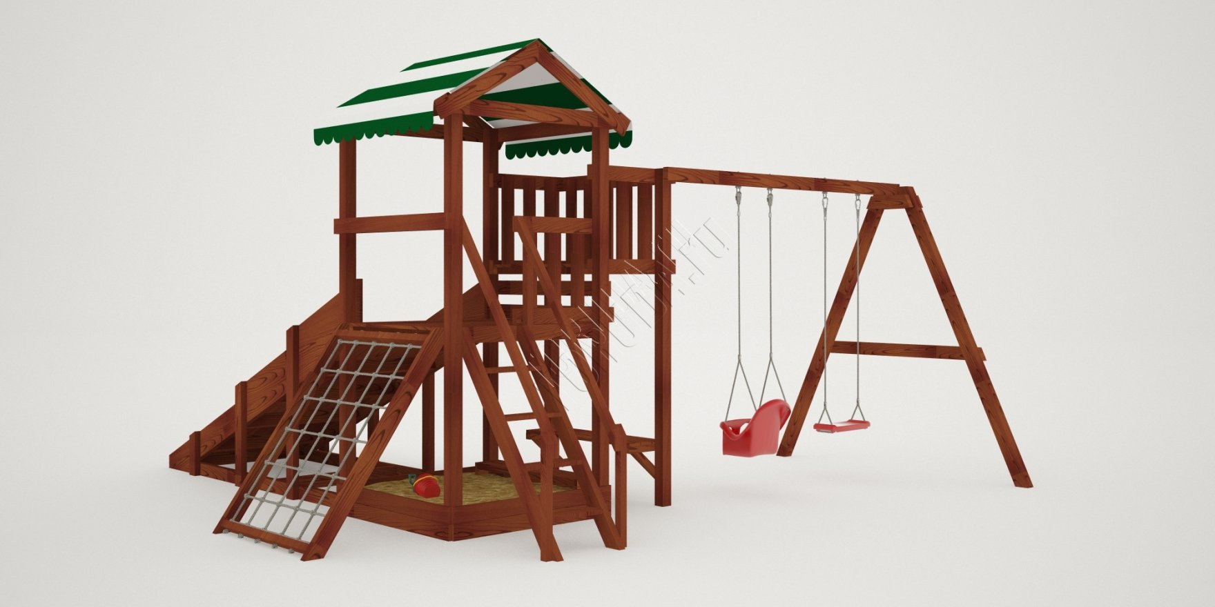 Центром площадки является игровая башня с высотой платформы 1200 мм и крышей, покрытой тканью или деревом. Забраться на башню можно несколькими способами: