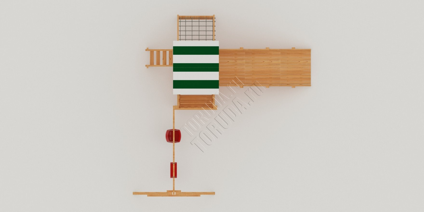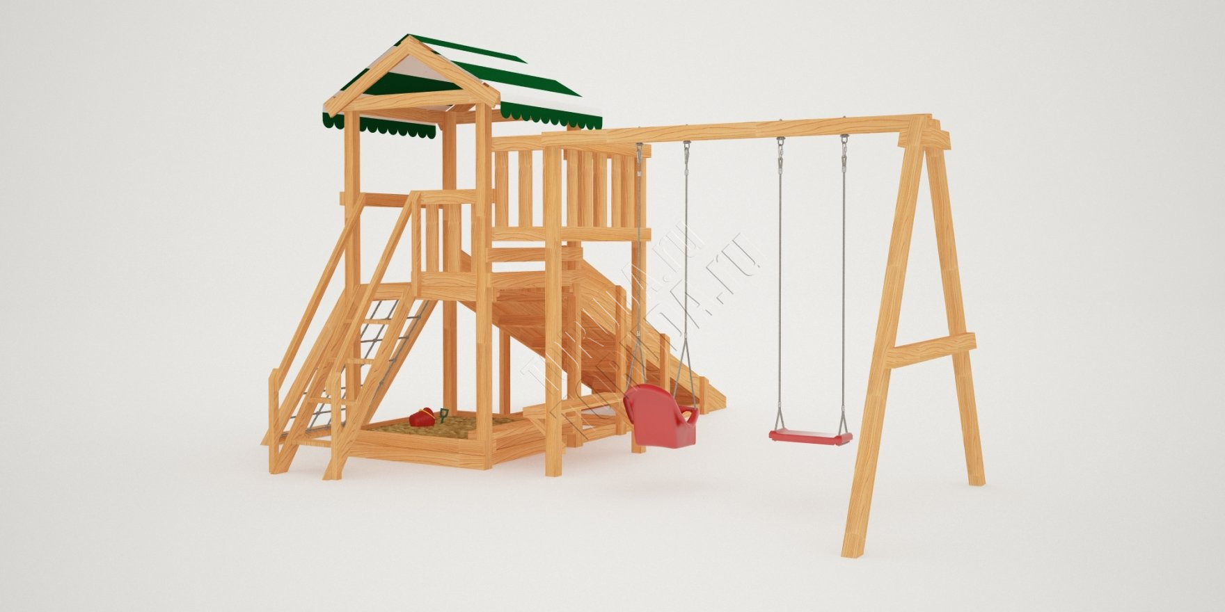 Поднявшись наверх можно поиграть на балкончике, с него будет открываться хороший вид на Ваш дачный участок. А быстро спуститься вниз малышам понравится с горки, цвет пластика на выбор: красный, желтый, зеленый, синий. Под платформой расположена квадратная песочница со сторонами 129 см, где можно более спокойно провести время, а отдохнуть на деревянной лавочке.