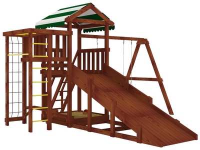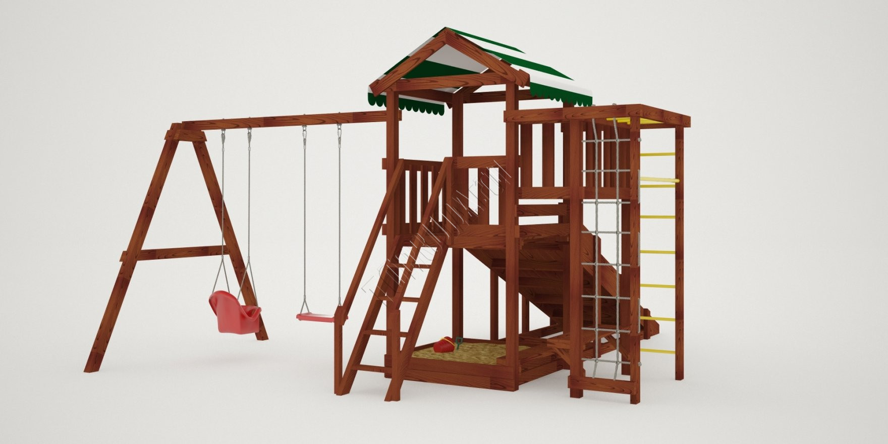 Конструкция сертифицирована и безопасна. Крепежи скрыты под хорошо закрепленными заглушками – поэтому даже малыши не поранятся. Каркас состоит из натуральных деталей – клееного бруса квадратного сечения со стороной 75 мм. Во избежание получения заноз и ссадин дерево отшлифовано, а края скруглены.
