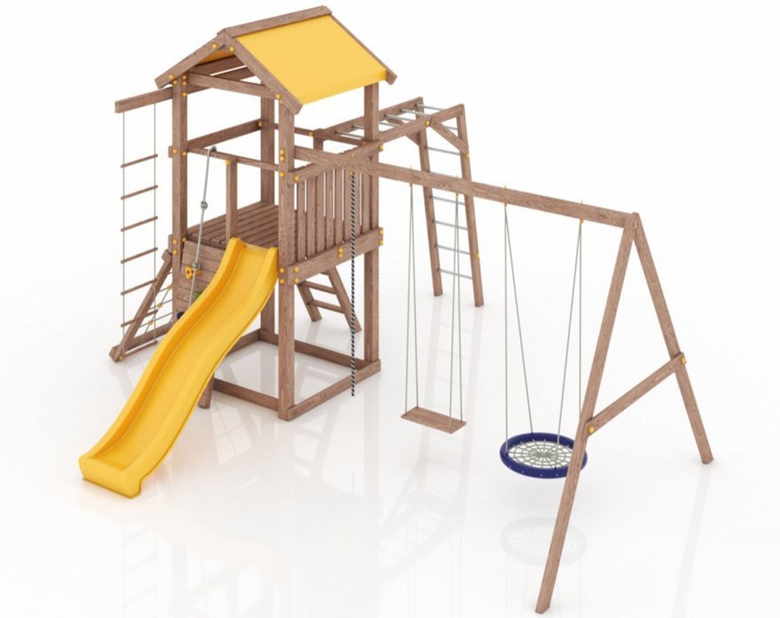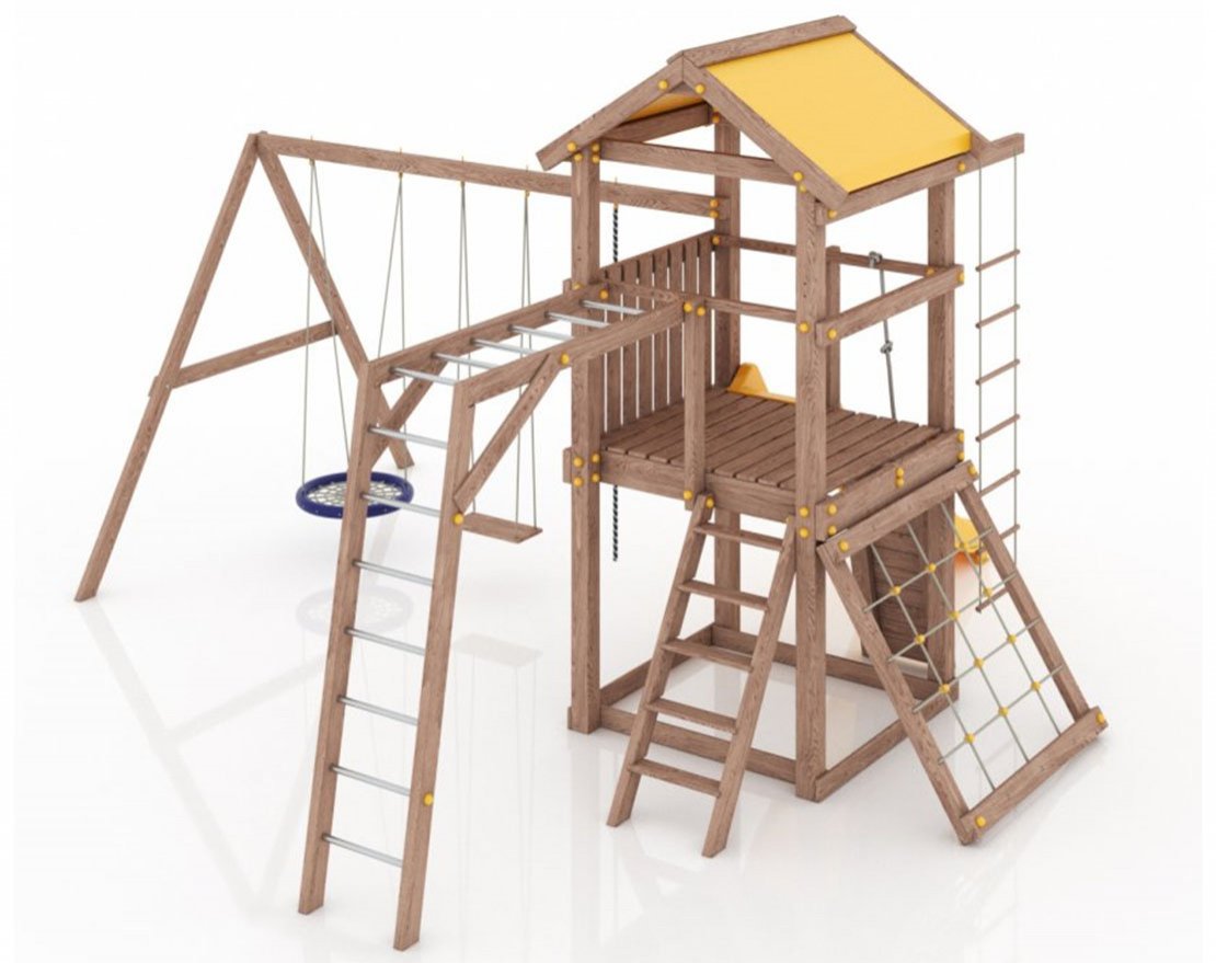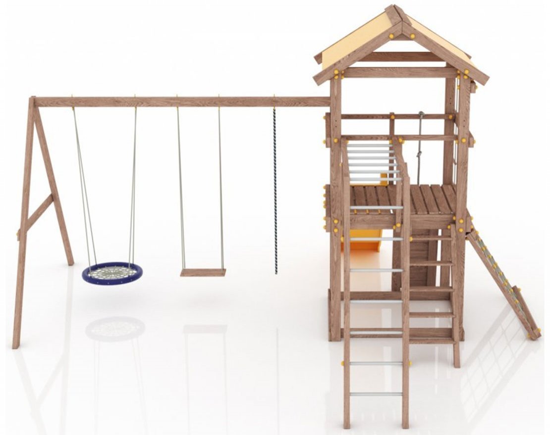 Детская площадка изготовлена в соответствии с ГОСТ Р 52168-2012. Опоры и несущие элементы изделия изготовлены из клееного бруса карельской сосны 90х90 мм, доска 40х90мм, 40х140мм, другие перекрытия 20х90мм доска, ограждение и иные элементы из массива сосны. Везде используется сухая доска.