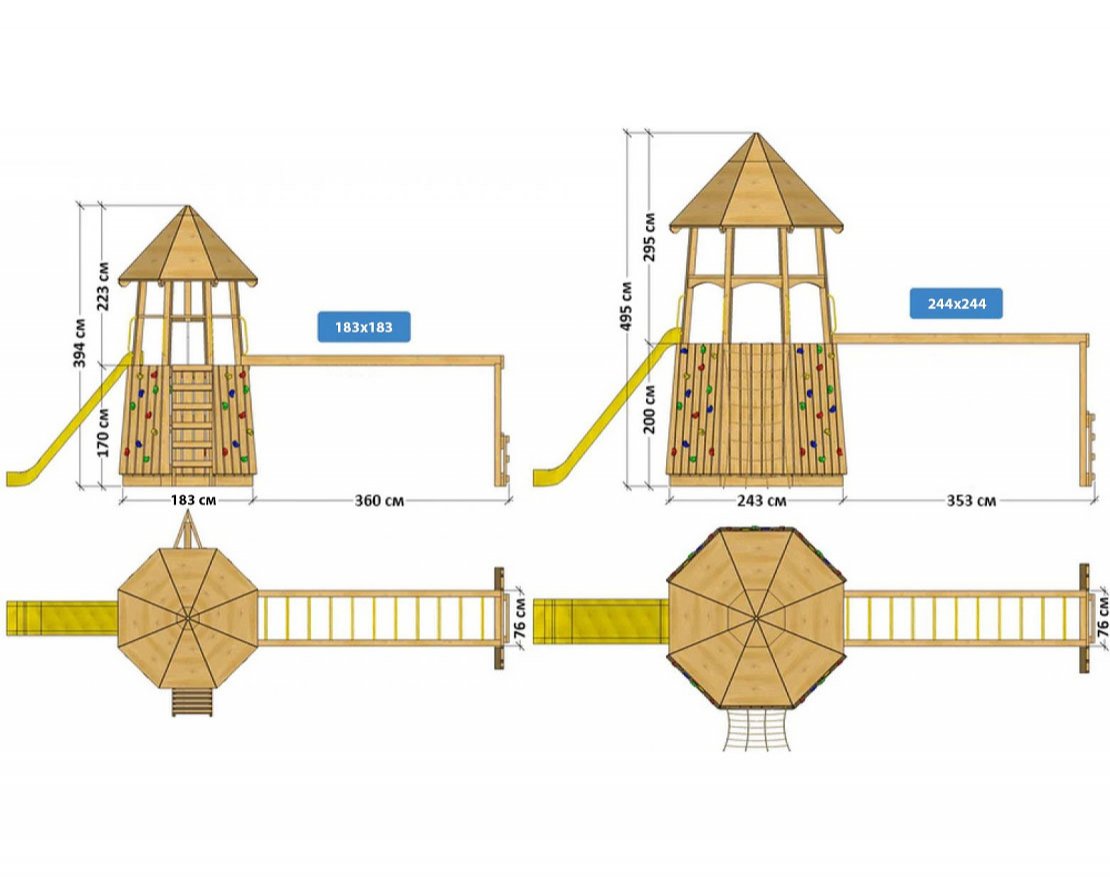 Оба варианта игровой башни включает в себя скалодром, рукоход и горку.