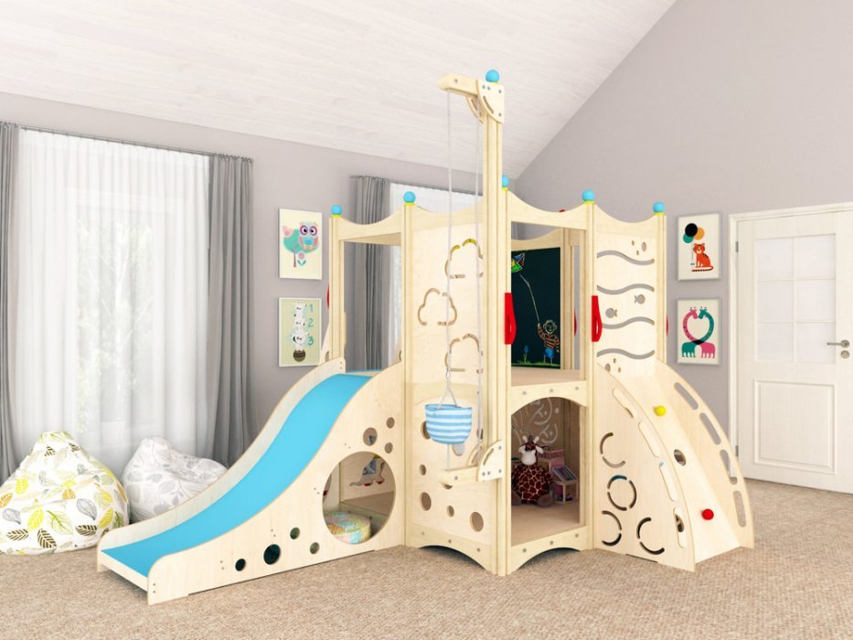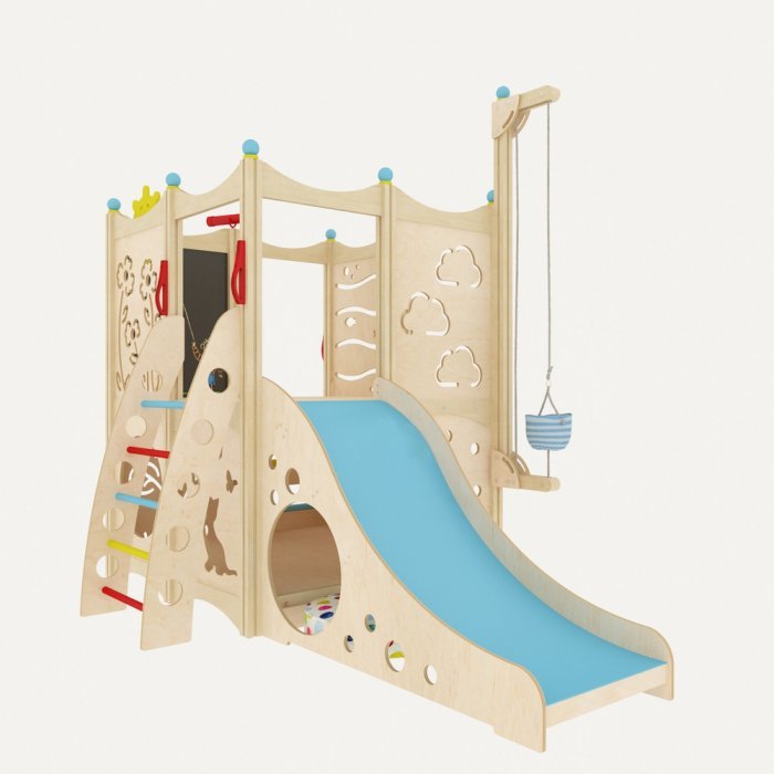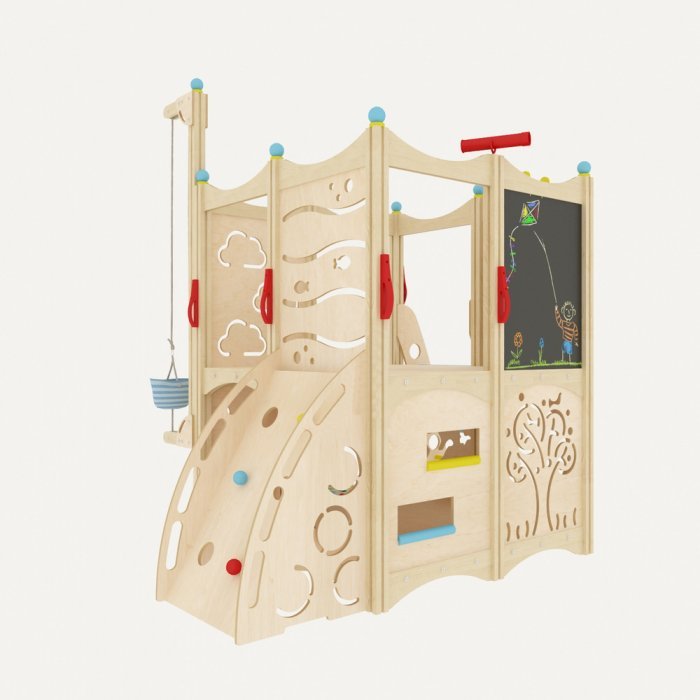 Фанера из берёзы – основной материал игрового комплекса. Эстетичный внешний вид ему придаёт масляная пропитка на нетоксичной основе. Все углы сглажены, поэтому риск получить травму сводиться к минимуму.