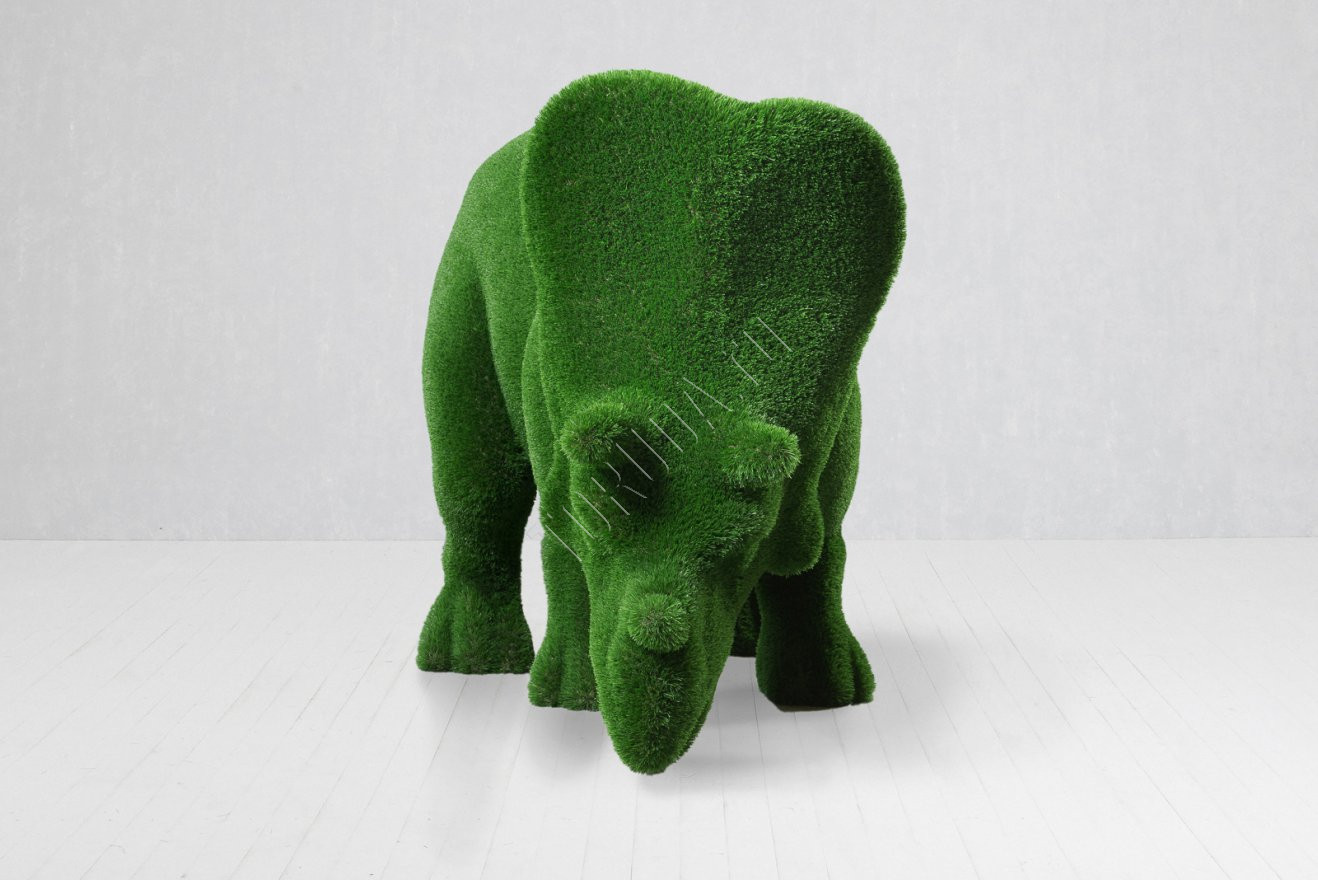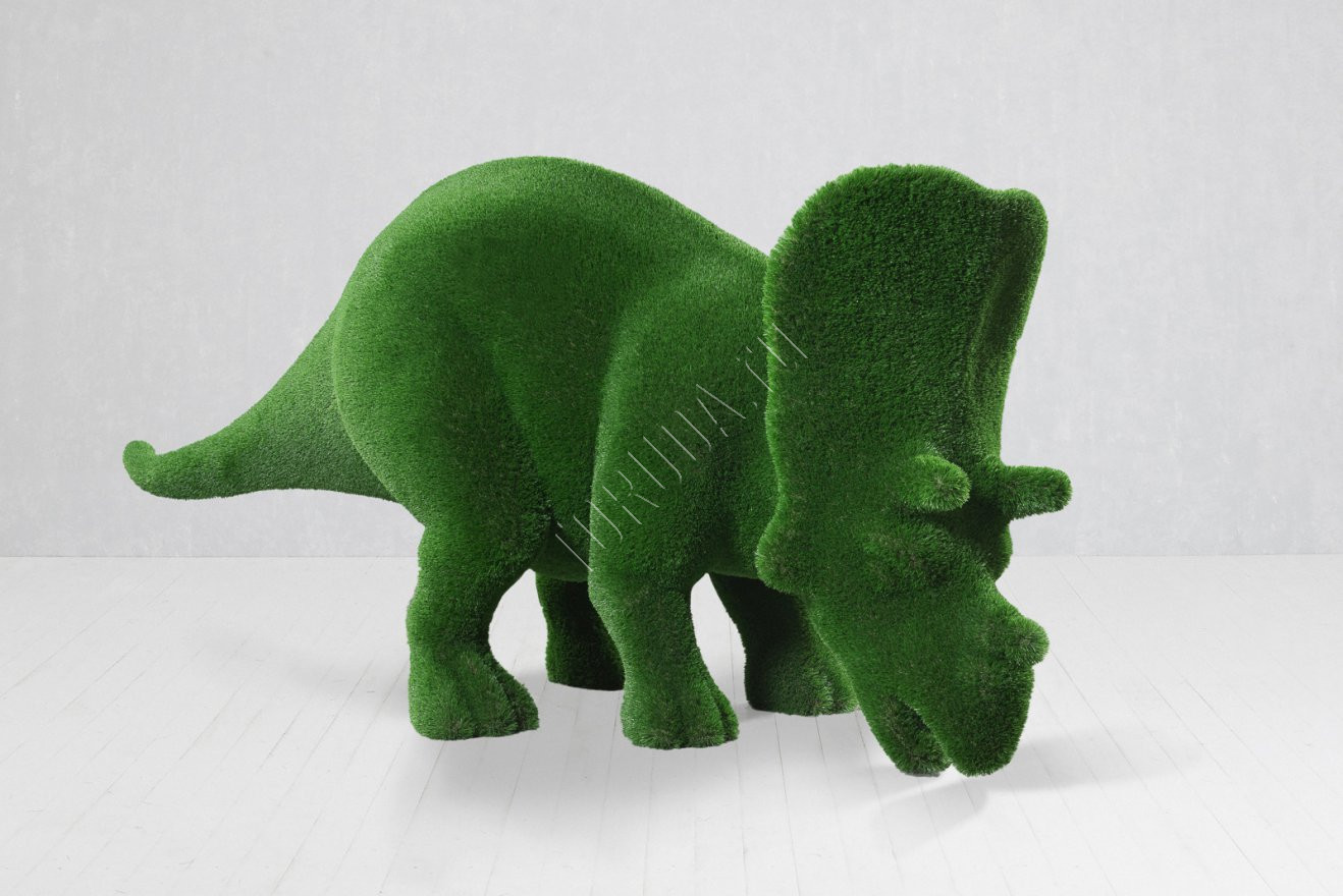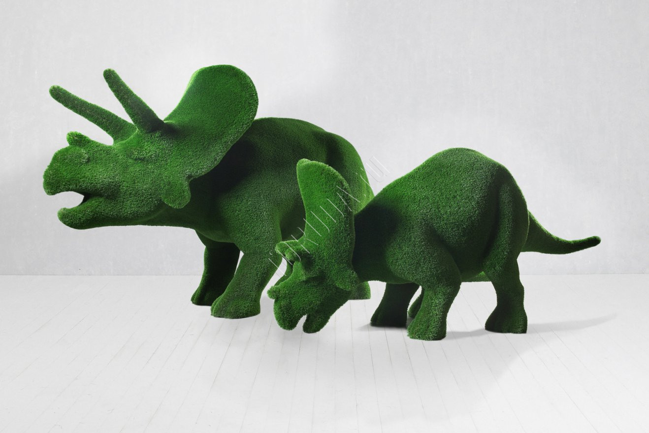 Топиари трицератопс — это ландшафтная фигура сделанная из сверх прочного стекловолокна и сверху обшита искусственным газонным покрытием высокого качества. Устанавливается для украшения современных ландшафтных территорий. Идеально вписывается в любой интерьер, привлекая к себе неравнодушные взгляды Ваших гостей и посетителей. Великолепно будет выглядеть у входа в ресторан или на хорошо выстриженной клумбе.