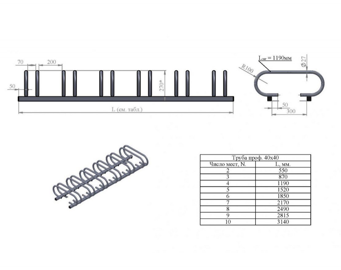 При изготовлении велопарковки на разное количество мест параметры длины: