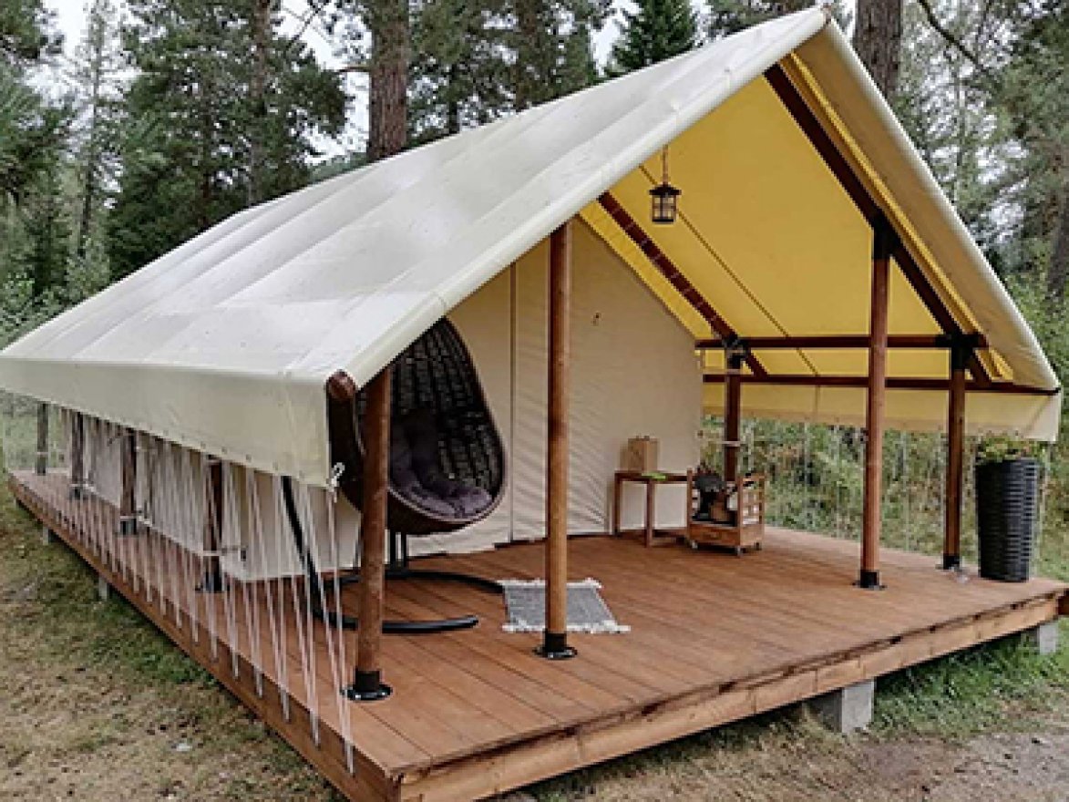 Сафари-тент — это комфортная палатка для глэмпинга, вмещающая от 1–2 до 4–6 человек. Представляет собой конструкцию на основе деревянного или металлического каркаса с двускатным навесом из ткани ПВХ и палаткой из износостойкой ткани Оксфорд , покрытие выдерживает температуру от -50°С до +70°С.