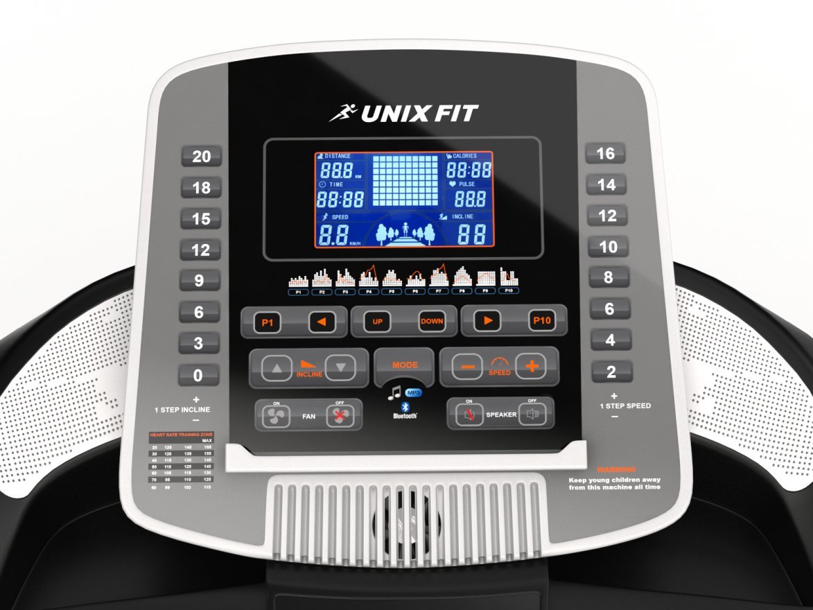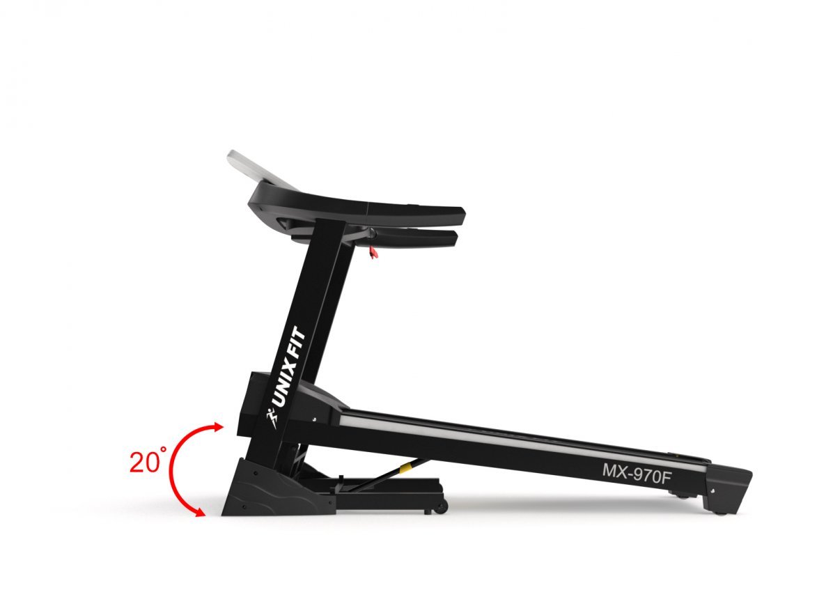 Максимальная скорость беговой дорожки UNIXFIT MX-970F составляет 22 км/ч, максимальный угол наклона бегового полотна 20 %. Беговая дорожка оборудована системой вентиляции Aircool. Вентилятор, встроенный в панель управления, создает необходимые для комфортной тренировки колебания воздуха.