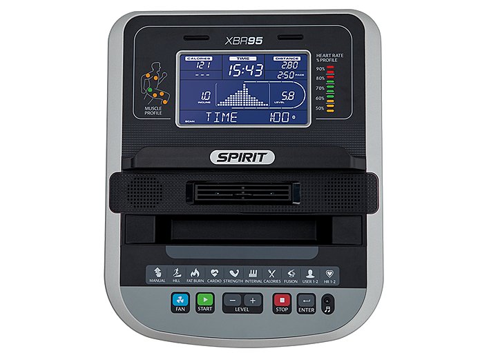 Горизонтальный велотренажер Spirit Fitness XBR95 оснащен встроенным генератором, тяжелым маховиком, хорошо читаемой консолью с голубой подсветкой и диагонолью 7,5 дюймов. Благодаря широким возможностям программного обеспечения пользователь имеет уникальную возможность получать информацию о том, какие мышцы максимально задействованы в ходе тренировки, с помощью фукции Muscle Activation.